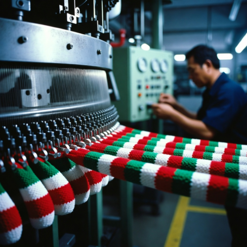 This is our technician operating an industrial knitting machine in the factory setting, producing striped red, green, and white fabric tubes specifically for dog Santa hats, with a close-up view on the circular knitting needles and the emerging fabric to demonstrate the precision and efficiency of the weaving process in an authentic production environment.