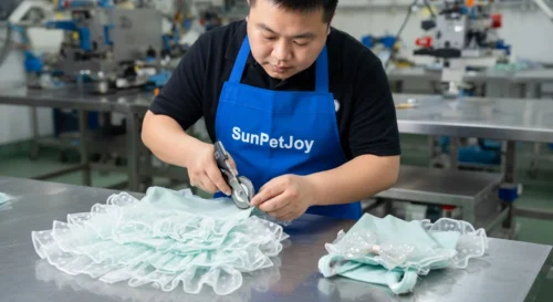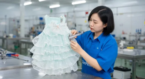 This is our thorough final quality inspection process involving thread trimming and precise dimensional checks on each finished dog wedding dress lace to guarantee consistency and superior craftsmanship for our wholesale partners.