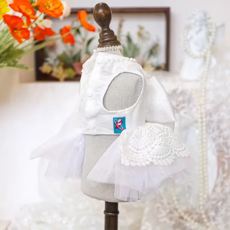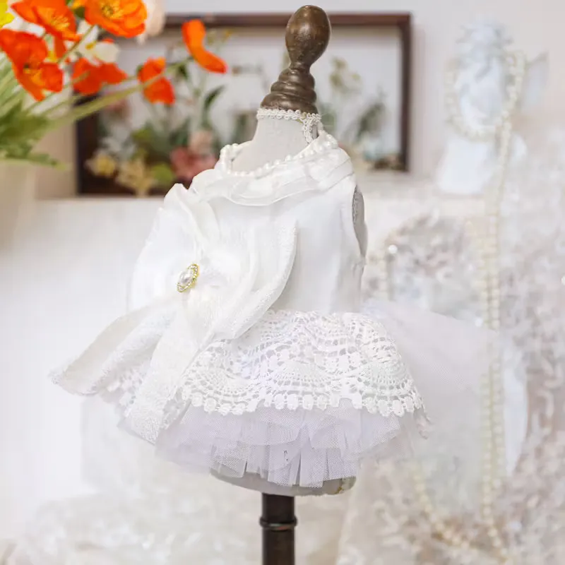 | Look & Structure | Lace/tulle layered skirt + decorative bow + bridal neckline detail (dog wedding costume look) |