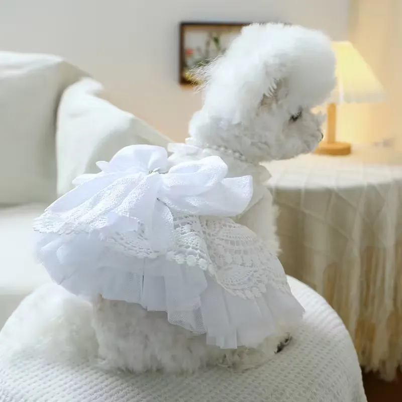 The layered lace + tulle skirt, pearl-style neckline detail, and oversized back bow deliver a true bridal look that retailers can merchandise as a premium “event outfit” SKU for small breeds.