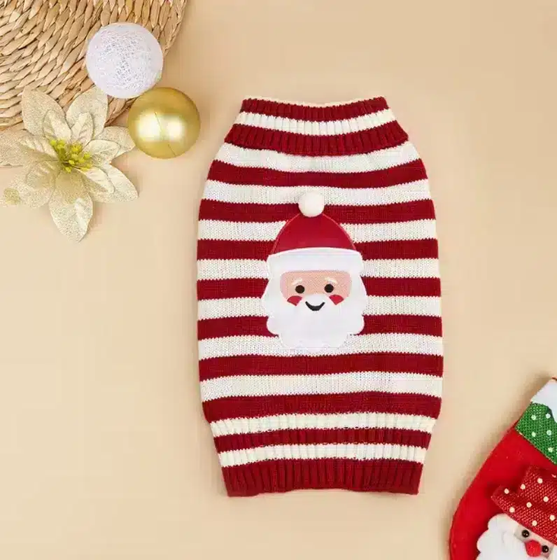 - “Thumbnail-first” design: bold stripe pattern + centered Santa patch creates an obvious focal point for product photos, making it a strong festive dog sweater option for seasonal campaigns.