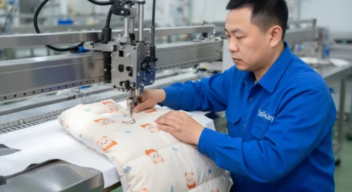 This is our specialized quilting process using advanced machinery to create patterned stitching that embeds cartoon bear designs and blue bow prints while forming the segmented puffer structure with superior precision and structural consistency.