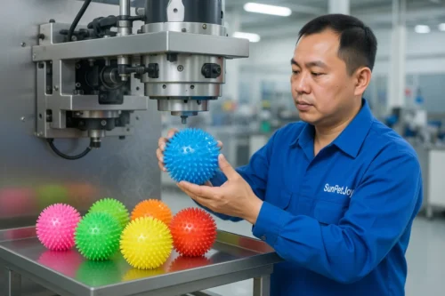 This is our precision injection molding step where skilled technicians carefully remove each freshly formed spiked ball ensuring exact color consistency and structural durability for reliable wholesale supply.