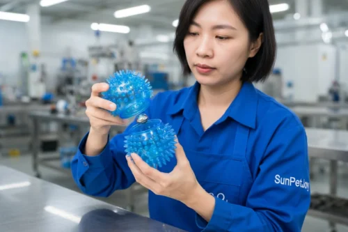 The manufacturing process for these durable chew toys for dogs begins with selection of appropriate plastic resin suited for durability and flexibility. Precision molds create the spiked exterior and hollow structure through injection molding or blow molding equipment. The sounding mechanism is inserted into the formed body before final assembly and sealing to ensure reliable activation. Subsequent steps include cooling the parts, trimming any excess material, and conducting visual and functional inspections on each batch to verify consistency. These methods support production flexibility across different equipment types and scales, enabling stable output that meets wholesale volume requirements while maintaining uniform quality to reduce potential defects in delivered goods.