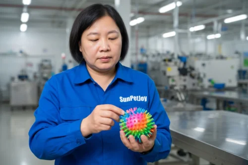 This is our assembly process where we precisely insert the internal sounding mechanism into every hollow spiked ball maintaining functional accuracy and quality standards for bulk pet toy orders.