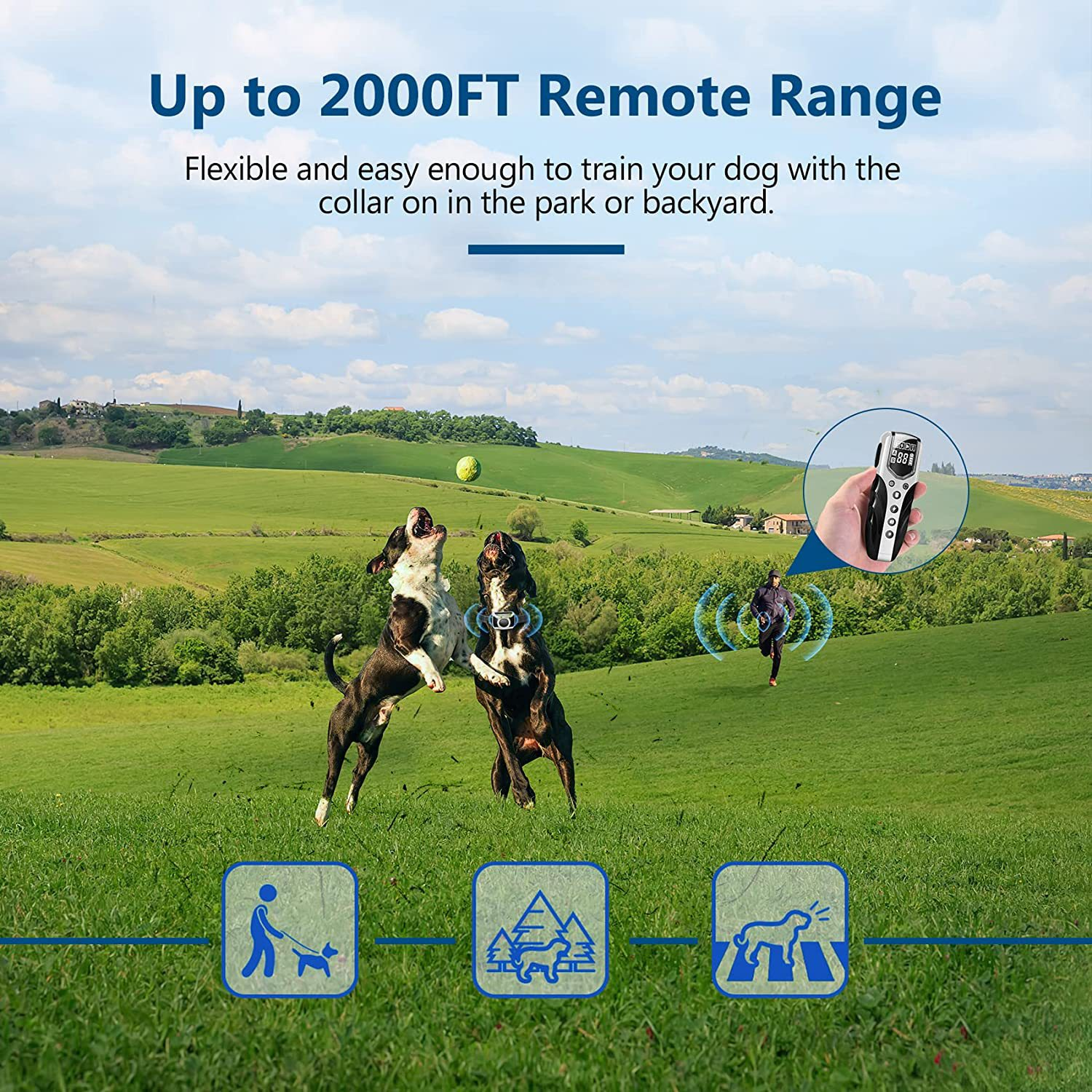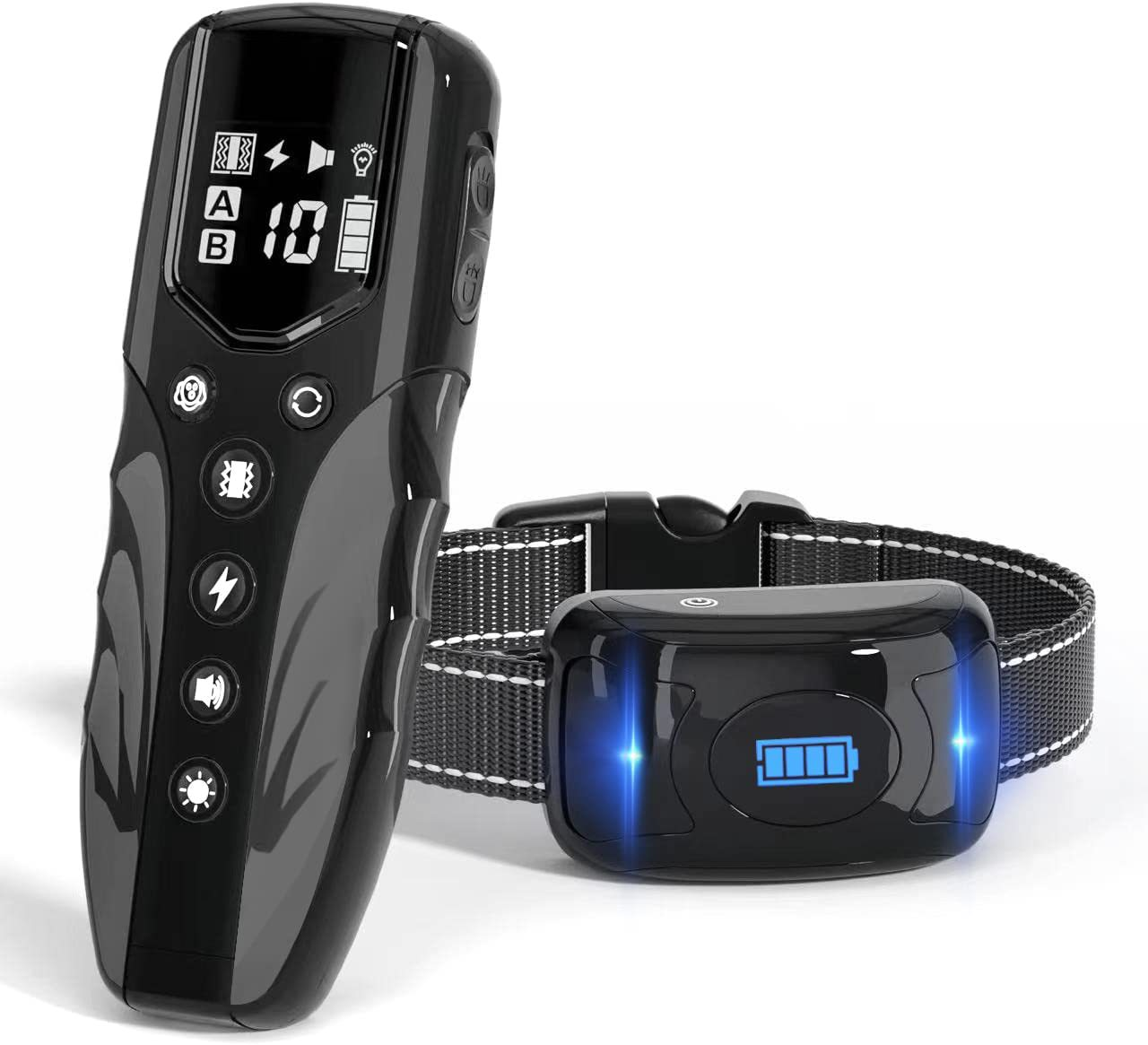 | Design | Remote transmitter with adjustable collar receiver, compact and fashionable appearance, LCD display with battery indicator and multi-function buttons |