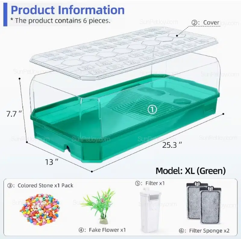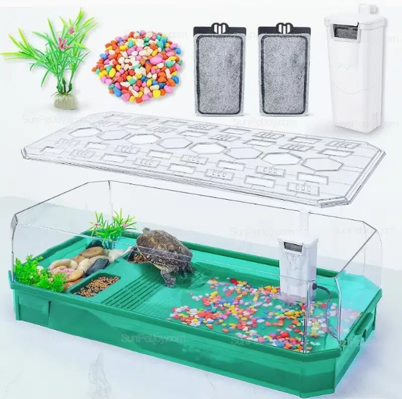 The molded base supports partitioned areas for feeding, swimming, basking, and planting, while the integrated pump and filter system helps maintain water quality with reduced maintenance frequency.