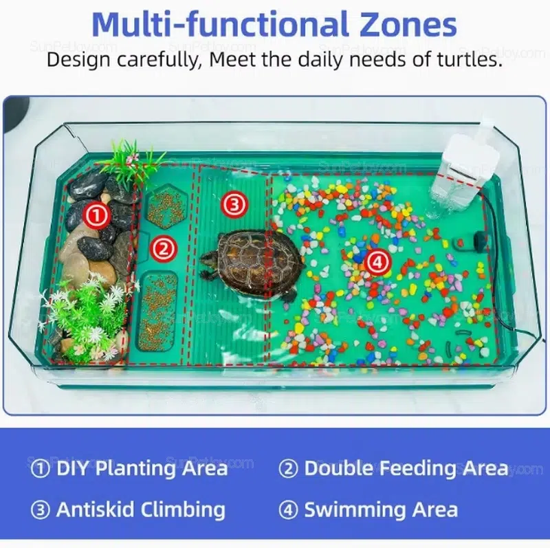 - Functional zones for feeding, swimming, climbing, and planting