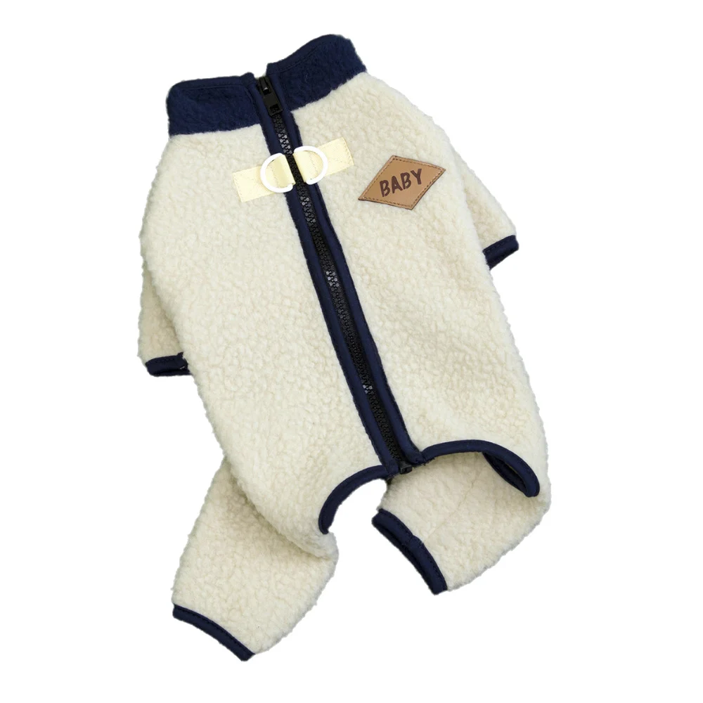 These fleece dog coats are functional jumpsuits constructed from sherpa fleece fabric in cream with navy trim. The design includes full-leg coverage and a back zipper for ease of use along with a signature BABY patch. This product serves wholesale pet apparel buyers, pet stores, online sellers, brand owners, and distributors who require consistent stock of small dog coats for various retail channels. The sizing supports inventory planning across multiple small pet categories while addressing needs for practical garments that align with daily routines for pets and their owners.