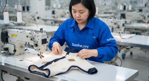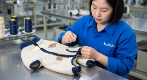 This is our trim and patch assembly process where openings receive attached trim and the signature patch is secured with precise stitching, upholding consistency and high standards for wholesale pet apparel.