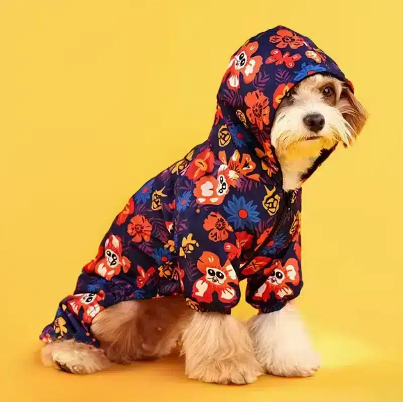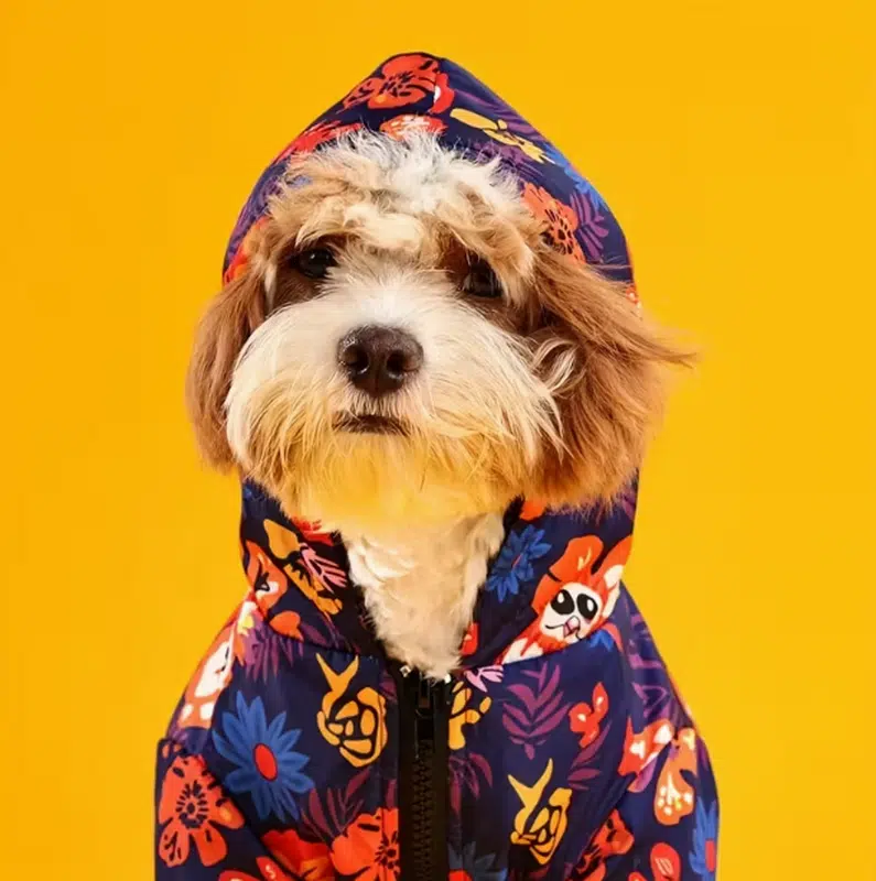 This floral winter dog jumpsuit delivers a bold, eye-catching look with full-body coverage for cold weather. The hooded design adds warmth, while the floral print helps brands create a standout seasonal style for online and in-store displays.