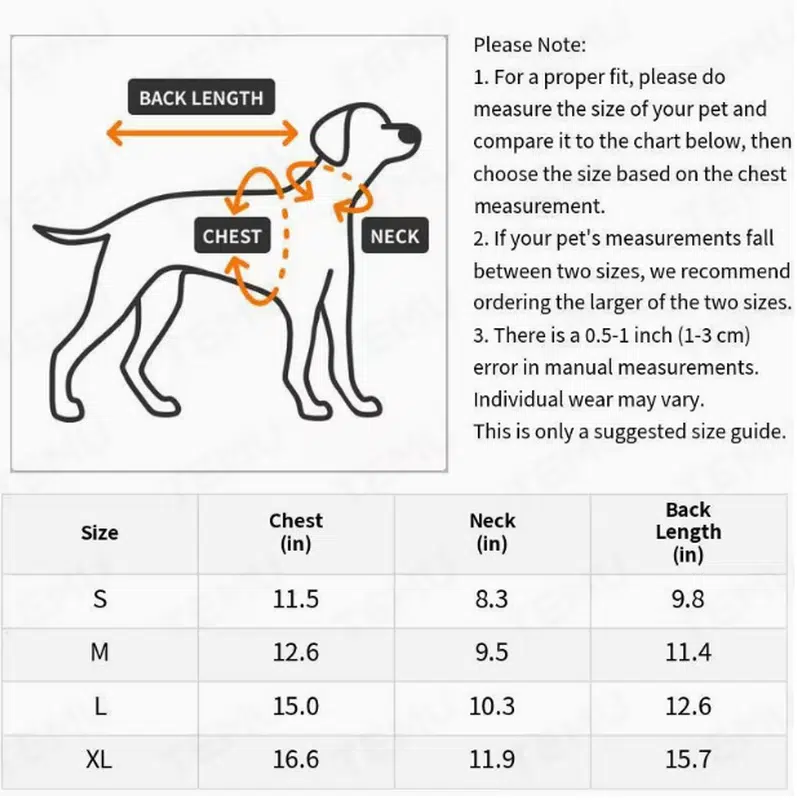 | Size | Chest (in) | Neck (in) | Back Length (in) |
