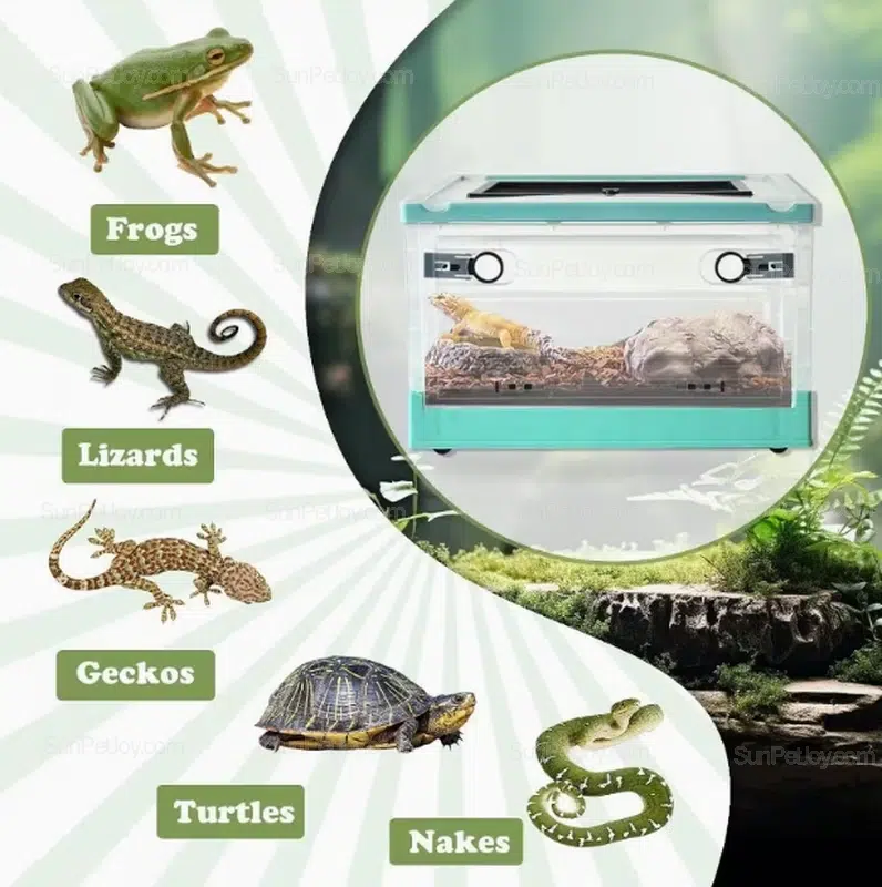 Designed for breeding, holding, and transport, this front-opening reptile enclosure features a ventilated mesh lid and supports factory customization for bulk programs.