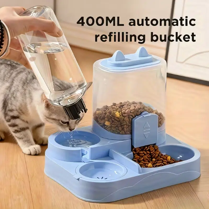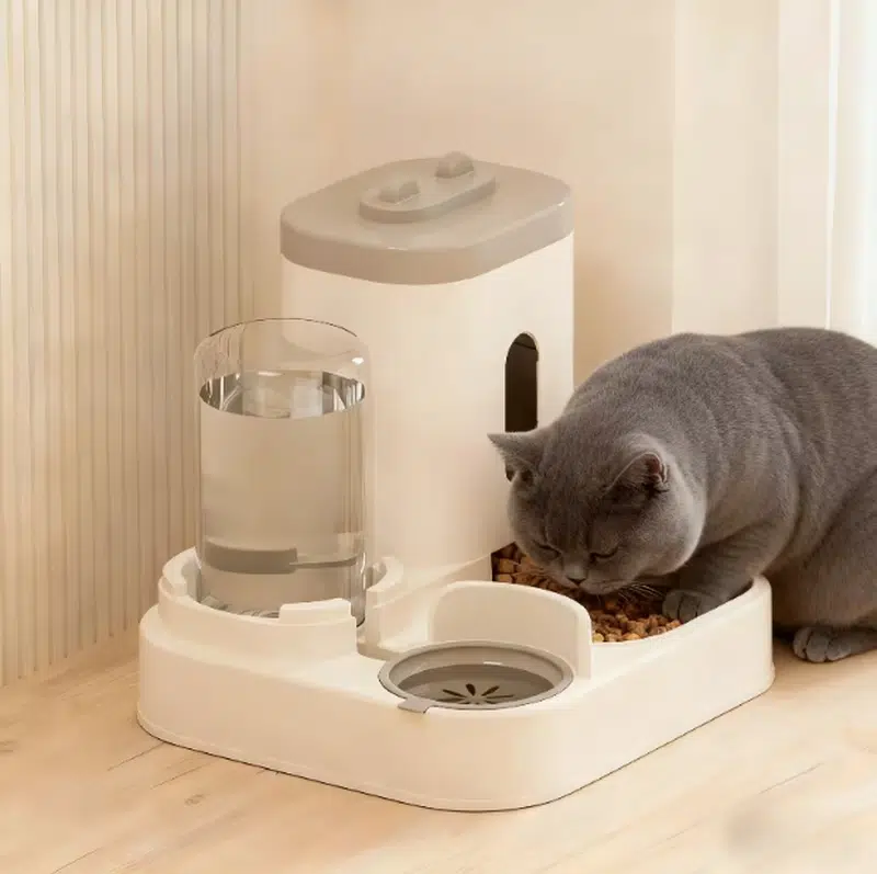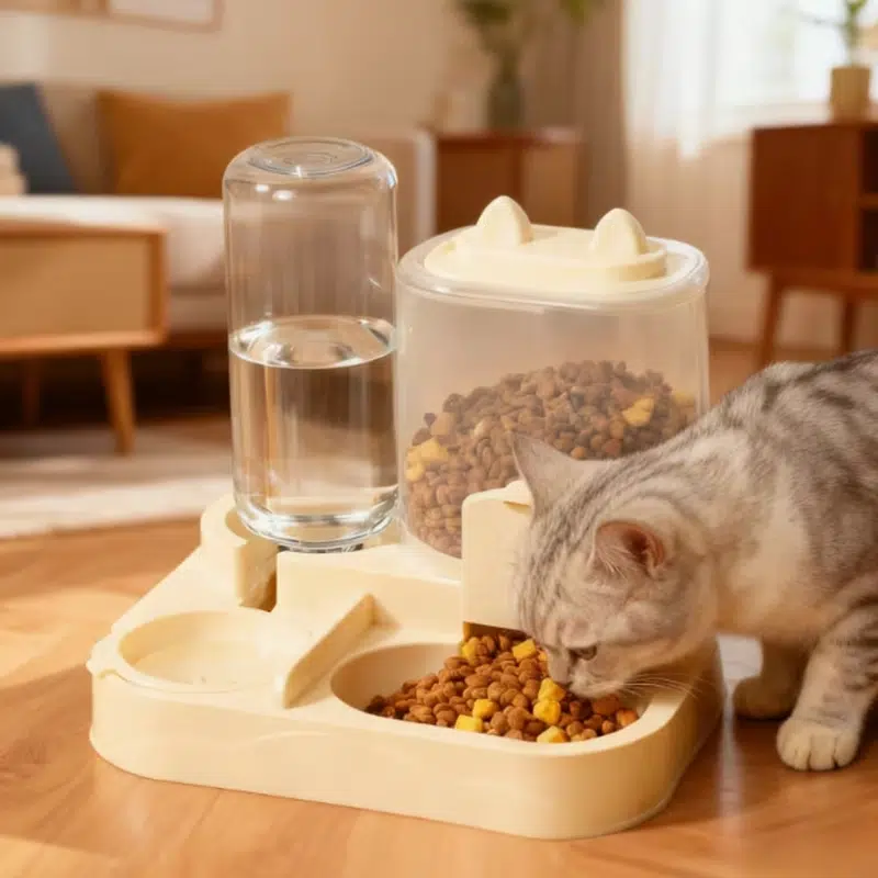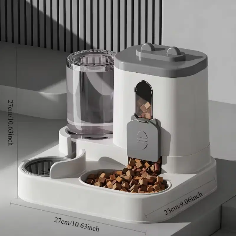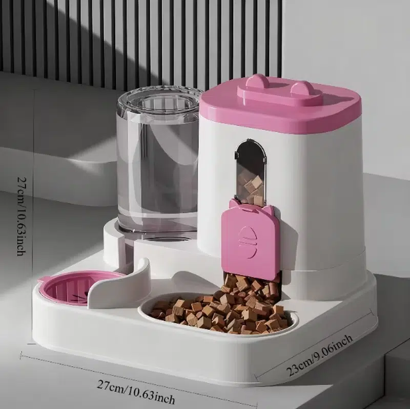 The integrated dual-bowl base supports daily feeding in homes, pet stores, shelters,