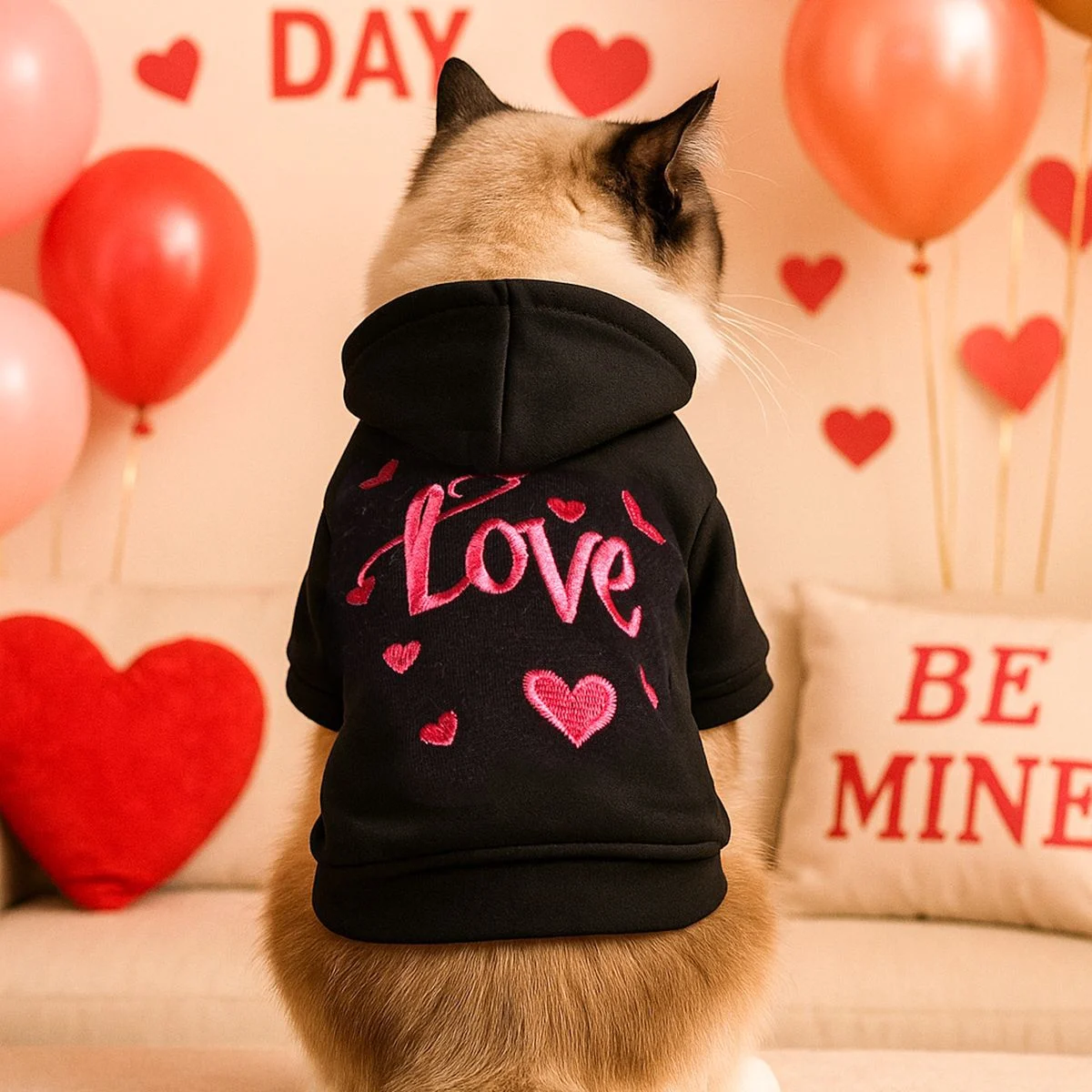 This is our custom cat hoodie in a sweet Valentine-style design, featuring a black hooded sweatshirt with bright pink “Love” embroidery and heart details on the back. We can customize this style with your preferred colors, embroidery artwork, holiday themes, logos, and sizes, making it a great option for seasonal collections, gift lines, and private-label pet apparel.