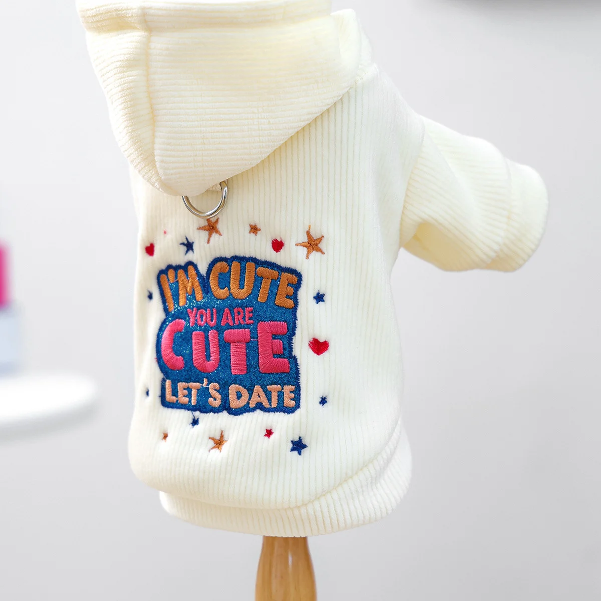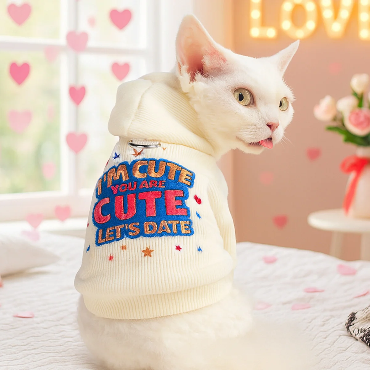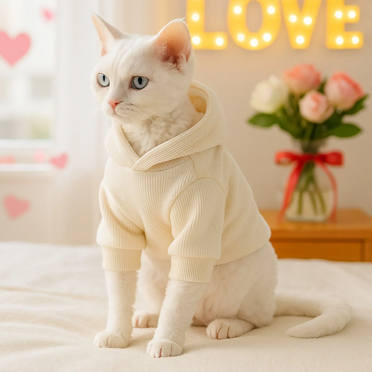 The hooded sweatshirt for cats is a ribbed knit polyester garment featuring an integrated hood, metal D-ring, and embroidered slogan with star and heart accents. Supplied in cream across sizes XS to XL, it offers chest measurements of 28-32 cm, 36-40 cm, 40-44 cm, 44-48 cm, and 52-56 cm, along with corresponding back lengths of 18-22 cm, 23-27 cm, 28-32 cm, 33-37 cm, and 38-42 cm. This design meets procurement needs for wholesalers, pet stores, ecommerce operators, and brand developers by delivering consistent quality. As a result, it supports cost efficiency through reduced replacement frequency, faster inventory turnover, and brand differentiation in the pet apparel segment.