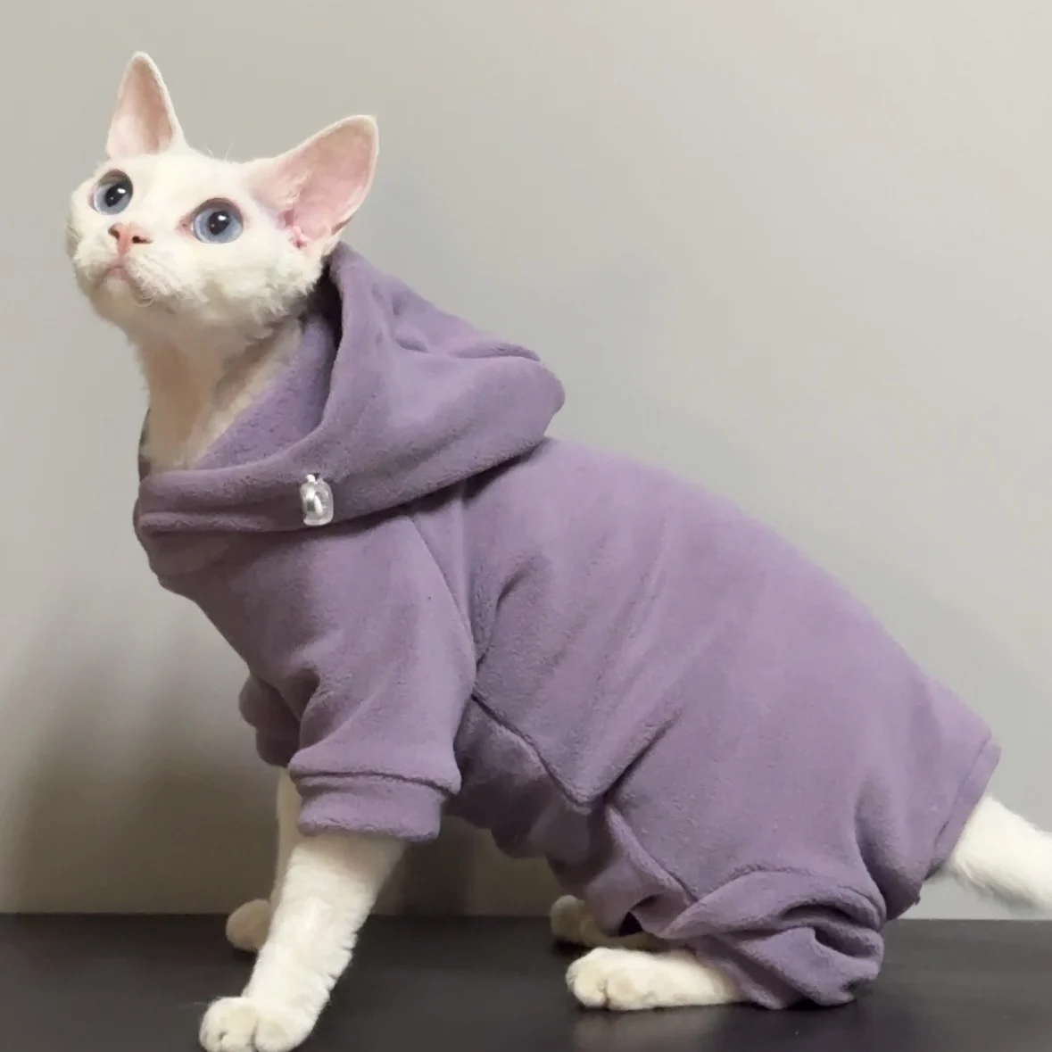 This is our custom cat onesie hoodie made from soft fleece fabric in a clean lavender color, designed to keep cats warm and comfortable while giving them a cute, modern look. We can customize this style in different fabrics, colors, sleeve lengths, hood details, and size ranges, so it works well for brand customization, boutique pet clothing collections, and made-to-order pet fashion lines.