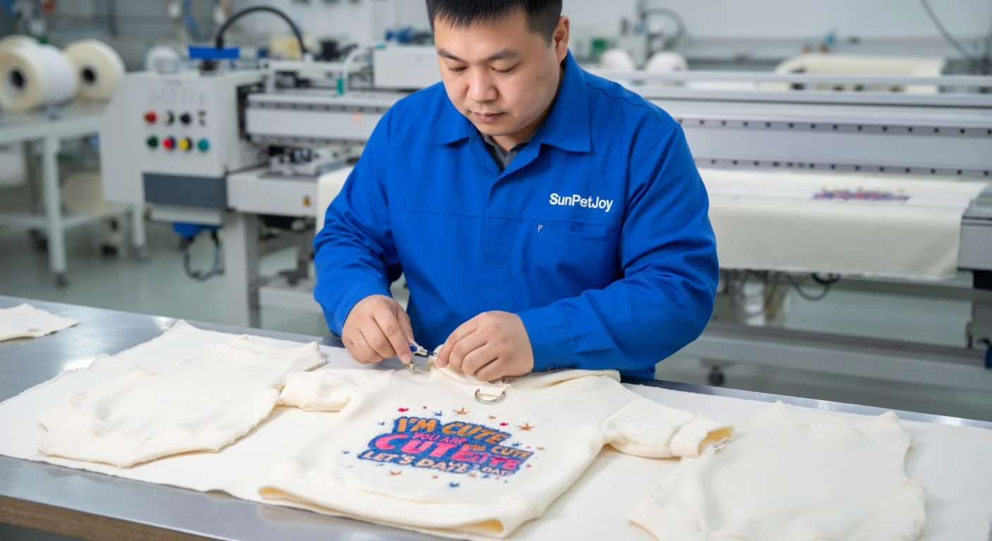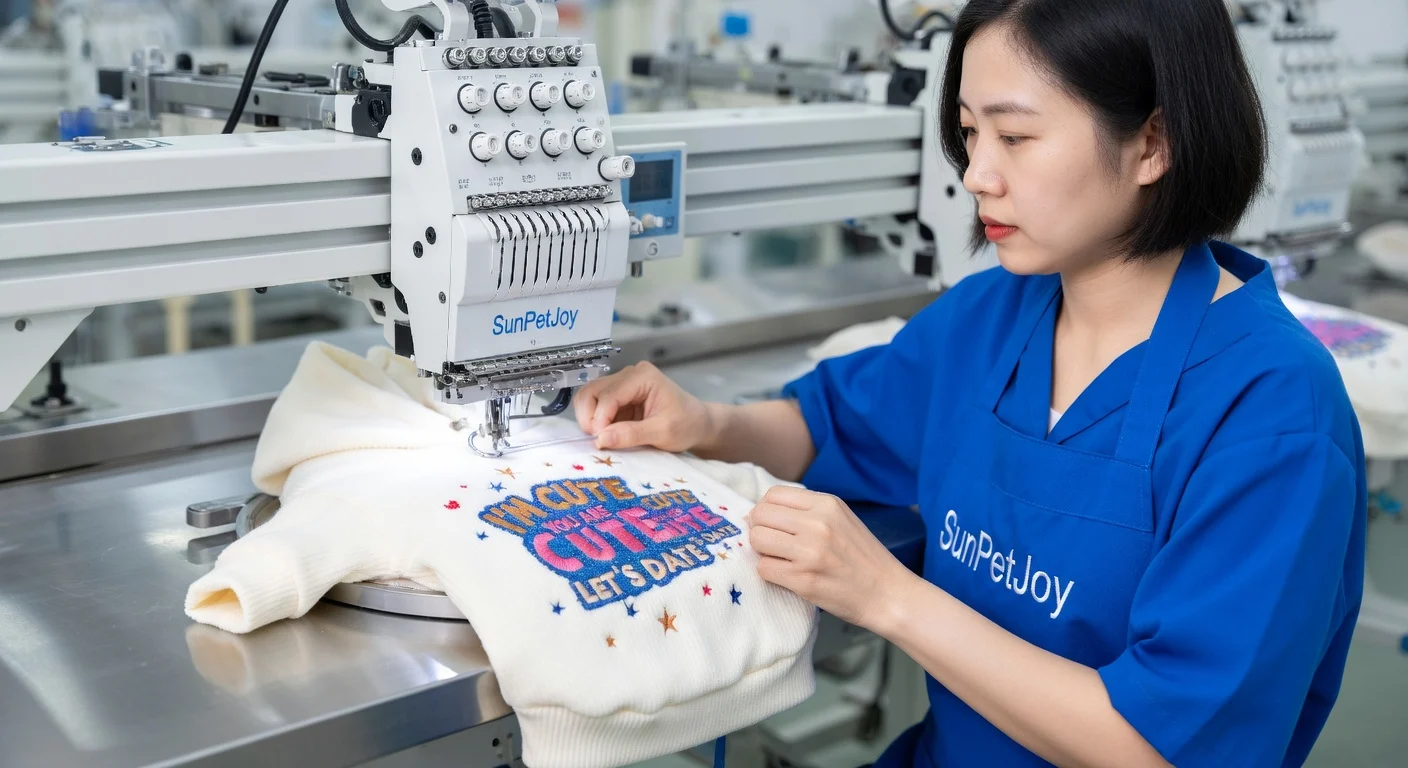 This is our computerized embroidery station where operators precisely apply colorful slogans with star and heart accents to the cream hooded pet sweatshirt, delivering design accuracy and long-term adhesion for dependable wholesale supply.
