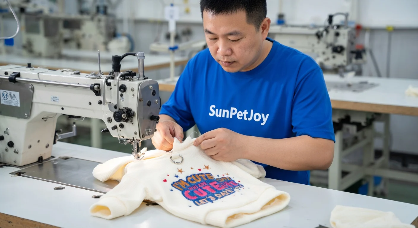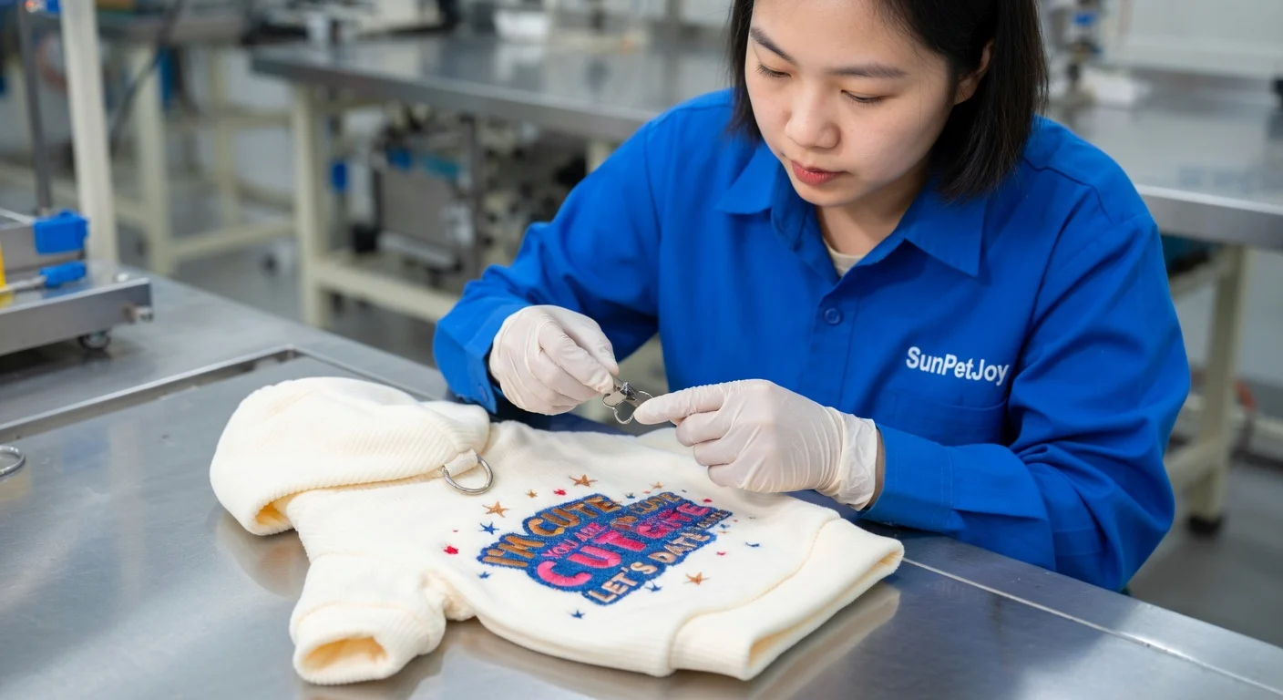 This is our detailed quality control inspection where inspectors verify seam integrity, embroidery adhesion, and dimensional tolerances on finished hooded pet sweatshirts, upholding the highest standards for wholesale reliability and batch consistency.