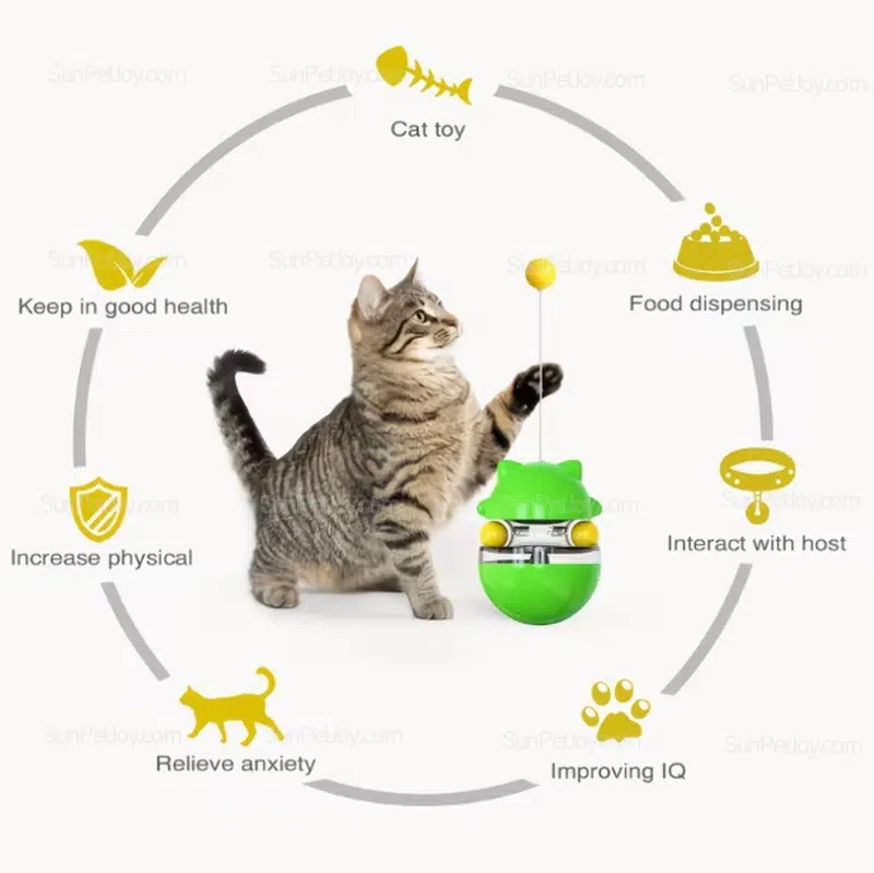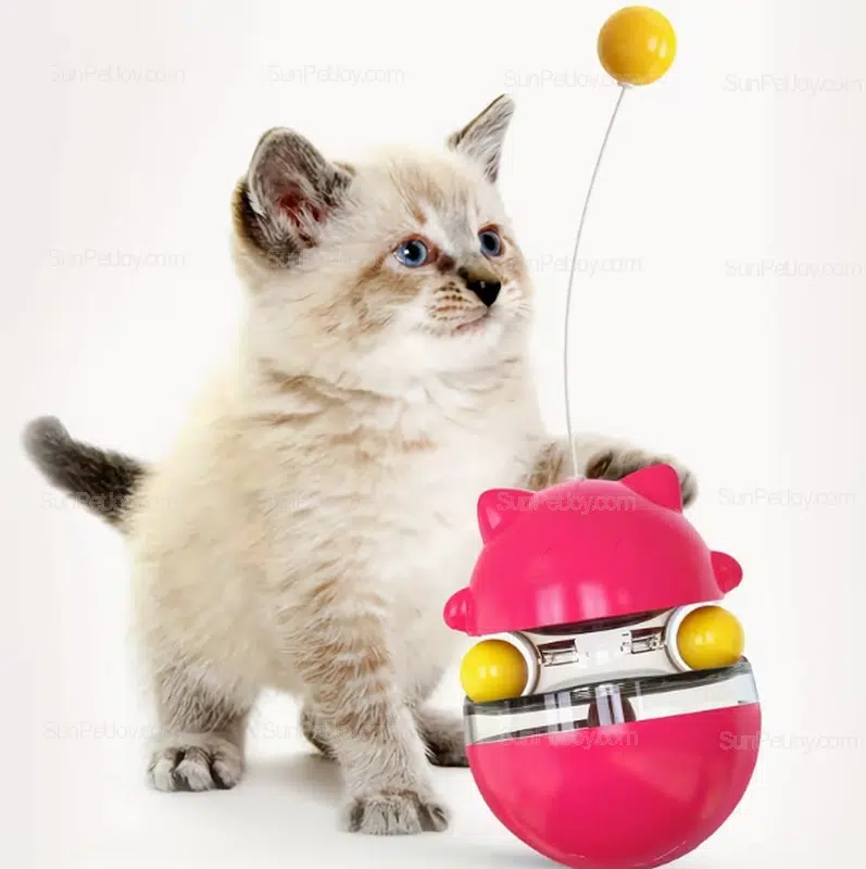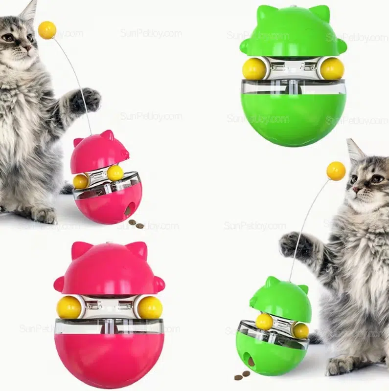 By combining a wobbling tumbler structure, dual rolling track balls, and a detachable teaser wand, this cat puzzle feeder encourages natural hunting behavior while slowing down feeding for indoor cats.