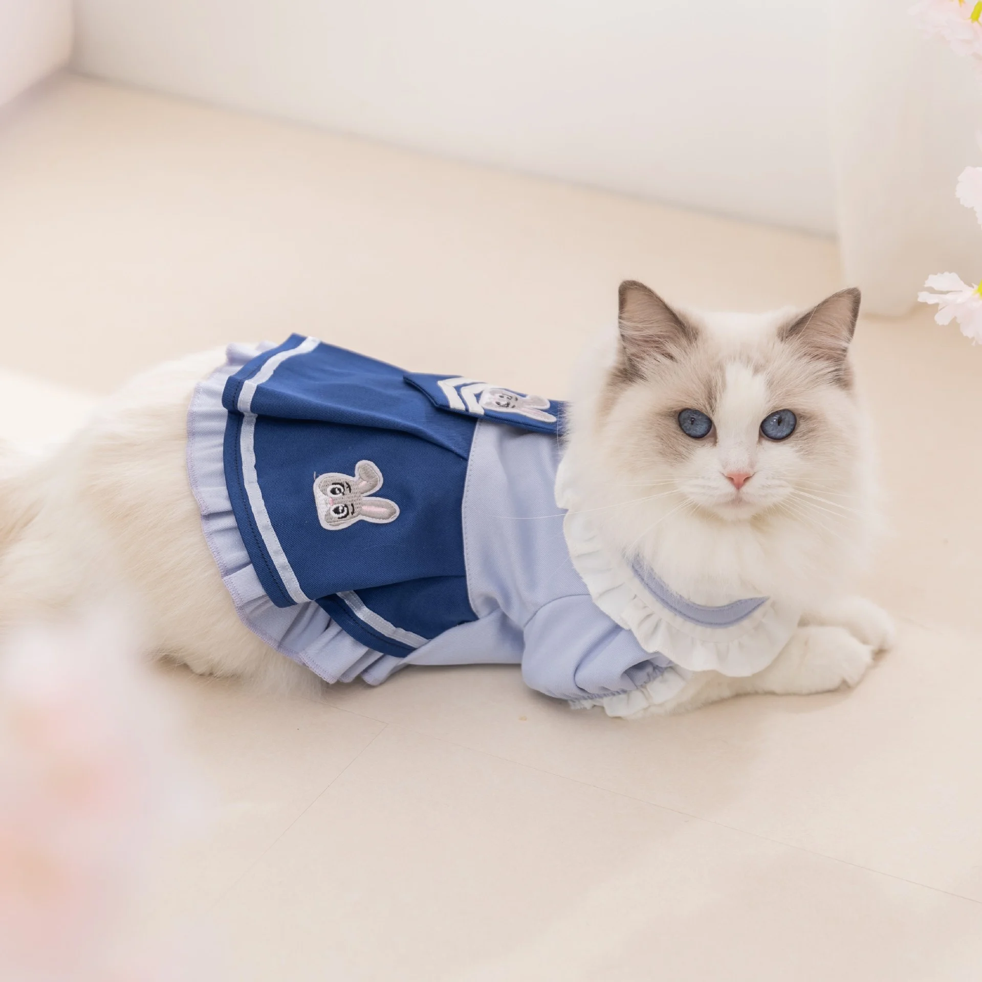 This is our custom cat sailor dress, designed in a soft blue color palette with a layered skirt, ruffle neckline, and cute embroidered details for a clean and playful look. It gives the outfit a sweet school-style feeling while still keeping the design light and comfortable for cats to wear. We can customize the fabric, color combination, embroidery pattern, collar style, skirt layers, and sizing to match different brand collections and seasonal themes.
