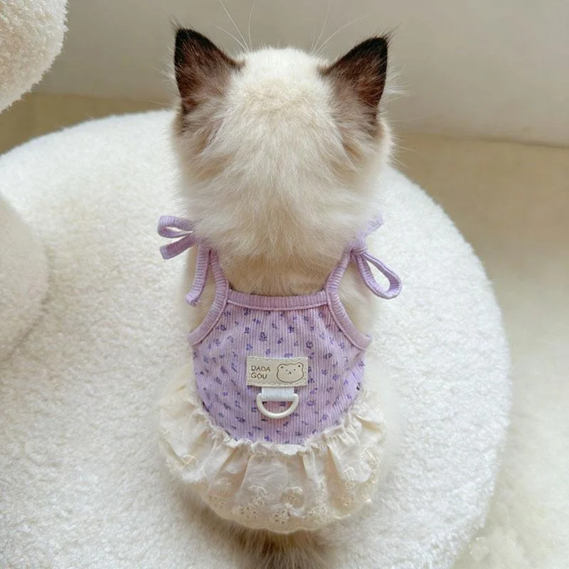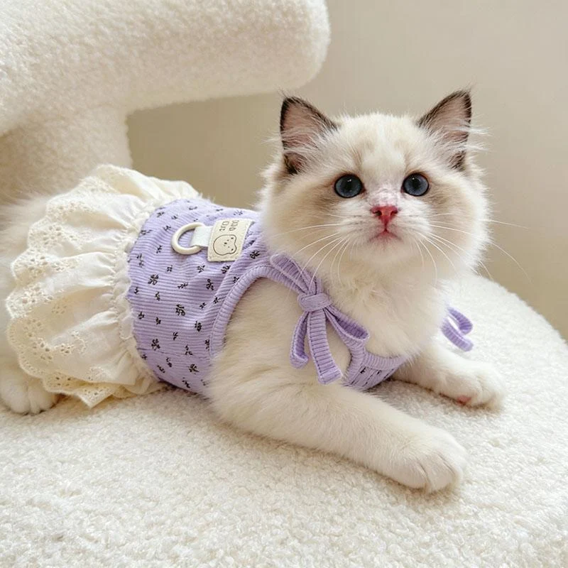 The kitten dress is a harness-style pet apparel item made with lavender ribbed fabric that incorporates a delicate all-over pattern, a detachable white lace ruffled skirt, an integrated metal D-ring, and adjustable bow ties. It is designed for wholesalers, pet stores, e-commerce sellers, brand owners, and procurement teams seeking reliable products that combine utility with presentation value. This item supports business objectives by enabling efficient inventory management and helping retailers offer solutions that address both functional needs for cats and practical requirements for owners.