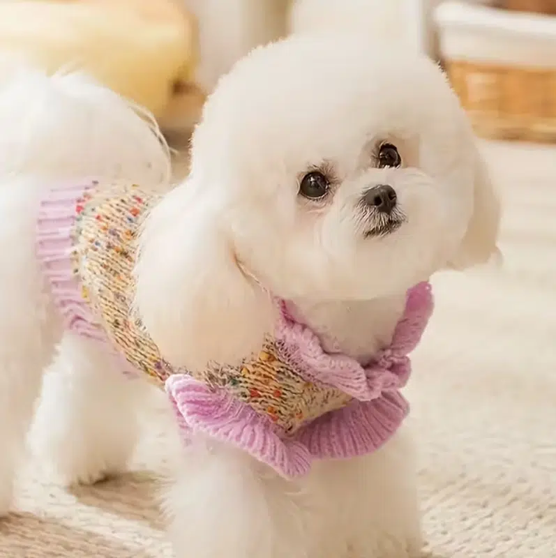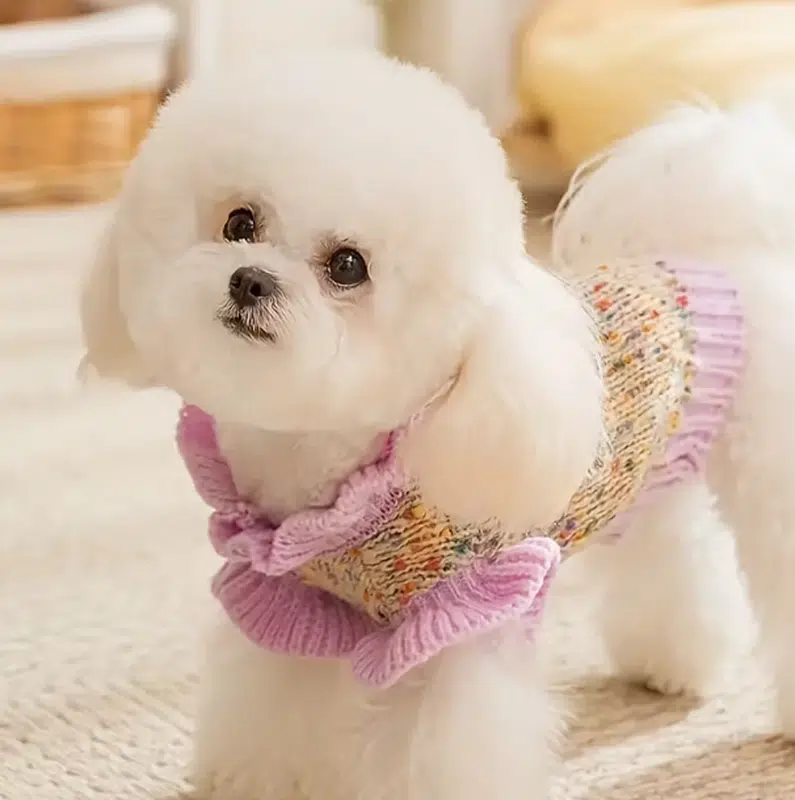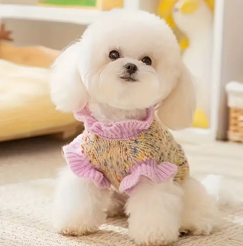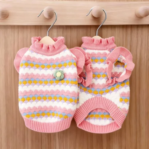 This is our adorable pink striped knitted dog sweater! It features a cozy turtleneck with cute ruffles, colorful horizontal stripes in soft pink, white, yellow, blue, and purple, plus charming ruffled sleeves and a sweet little flower decoration on the chest. Perfect for keeping your pup warm and stylish every day. And the best part? We can customize these styles in any color, pattern, size, or with different embellishments you love.