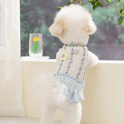 This is our lovely floral knitted dog vest! With its delicate blue flower embroidery all over, pretty ruffles and fringe trim at the bottom, a charming colorful flower appliqué, and a handy leash ring on the back, it’s both elegant and practical for your furry friend. Super lightweight yet cozy for everyday wear. We can customize this exact style however you want — different colors, floral designs, or any special touches you desire.