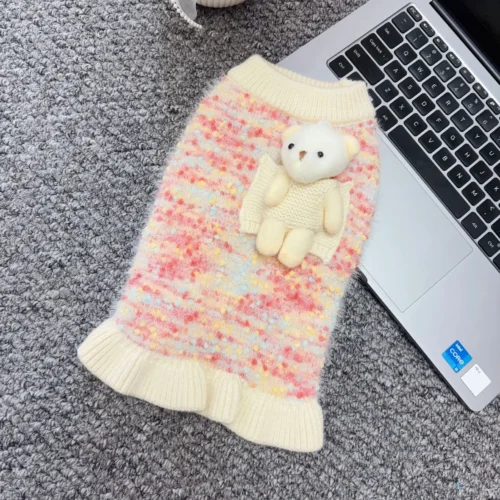 This is our soft and colorful fuzzy knitted dog jumper! It has a beautiful speckled pastel pattern in pink, yellow, and blue tones, a classic crew neck, and an adorable attached teddy bear decoration that adds extra cuteness. It’s incredibly plush and warm for those cooler days. We offer full customization on all these styles, so you can choose colors, fabrics, sizes, or different cute details to make it uniquely yours.