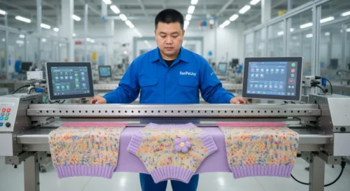 This is our computerized flat knitting process where technicians monitor machines to produce uniform panels for our knitted dog jumpers ensuring precise color pattern and design consistency for reliable wholesale supply.
