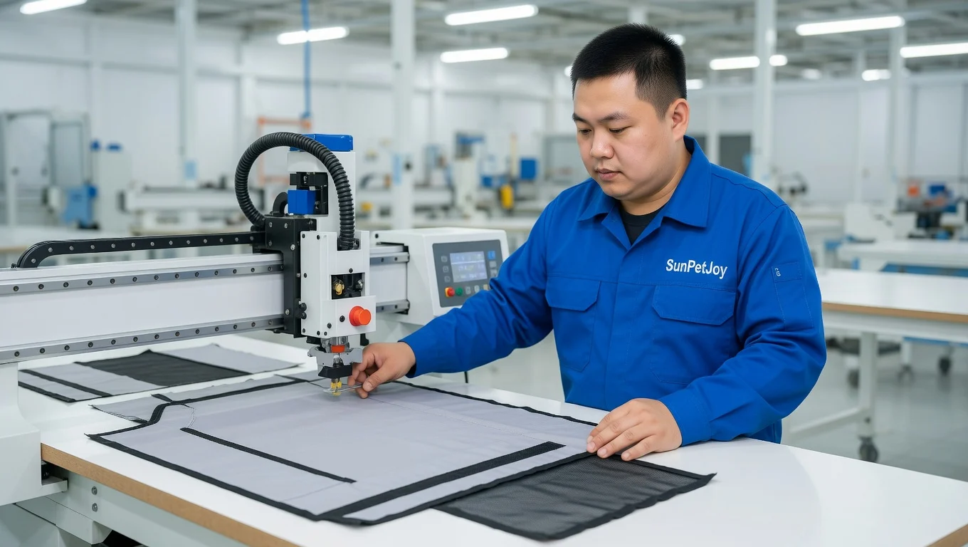 This is our advanced CNC cutting system that precisely cuts Oxford cloth and mesh patterns for our large portable pop-up pet tents, ensuring exact dimensions and material consistency for dependable wholesale quality and reliability.