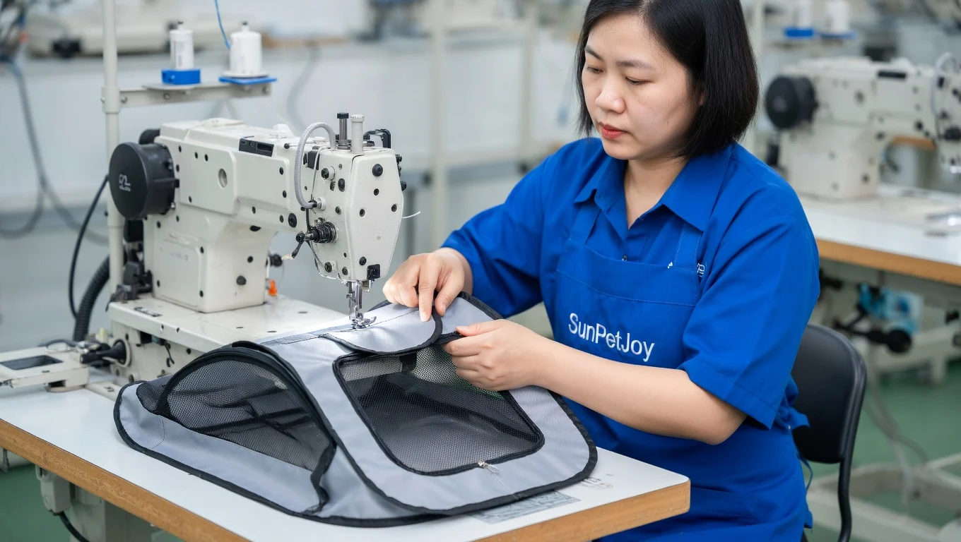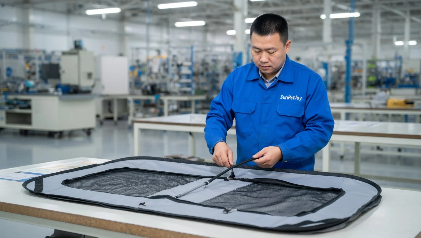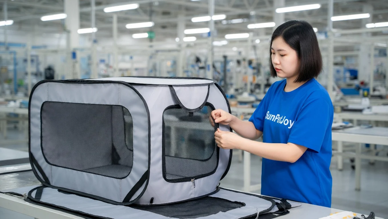 This is our multi-stage quality inspection and functional testing station, where finished pop-up pet tents undergo thorough seam mesh and folding checks to ensure precision consistency and performance for every wholesale batch.