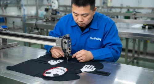 This is our meticulous assembly stage securely integrating Velcro fastening straps into our Large Dog Halloween Costumes, guaranteeing secure fit consistency and long-term reliability for wholesale partners.