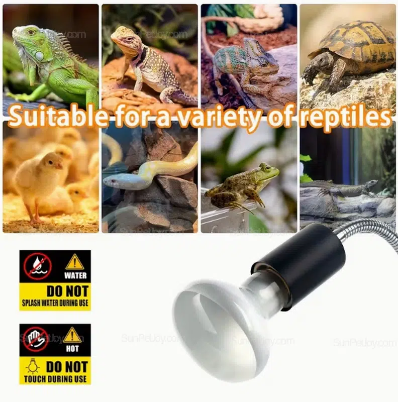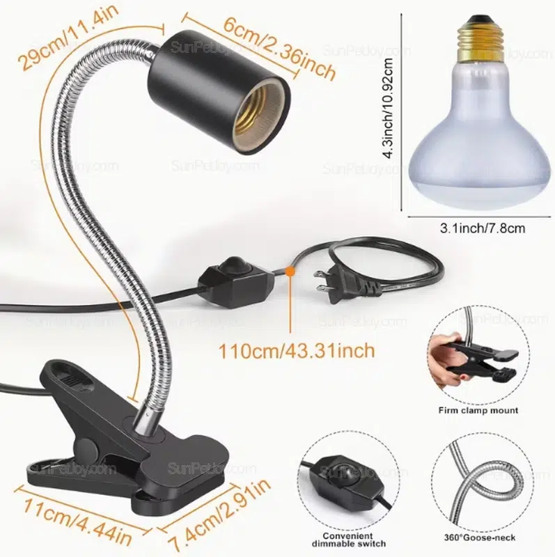 This lizards basking heat lamp is developed for controlled heating in reptile habitats where stability, adjustability, and long-term use matter. Designed around a flexible clamp structure and dimmable heat output, it supports professional setups for breeding facilities, specialty reptile retailers, and private-label programs.