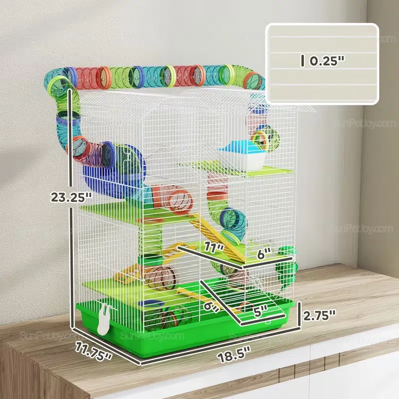 Crafted with durable wire framing and vibrant green accents, it includes essential accessories like an exercise wheel, ramps, a cozy hut, platforms, a food dish, and a water bottle. The detachable bottom tray ensures effortless cleaning, while front doors provide convenient access. Perfect for hamsters, gerbils, and dwarf rats, this cage supports their natural burrowing and climbing instincts.