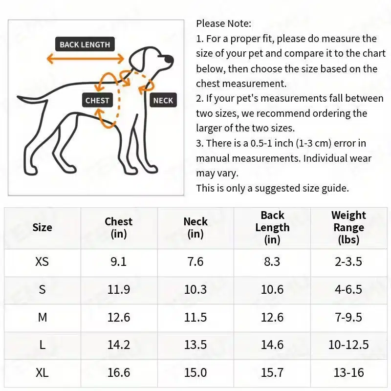| Size | Chest (in) | Neck (in) | Back Length (in) | Suggested Weight (lbs) |