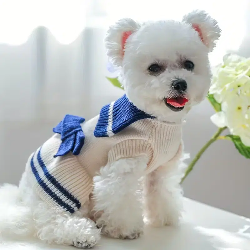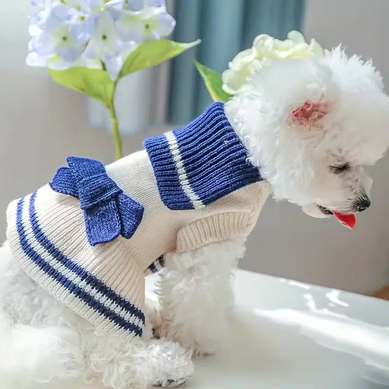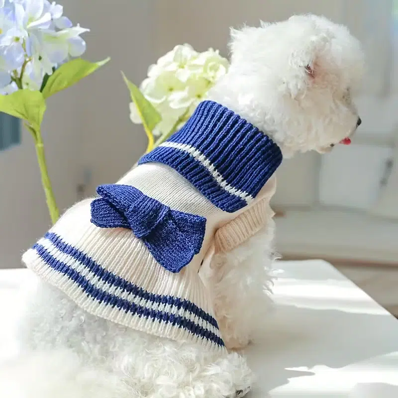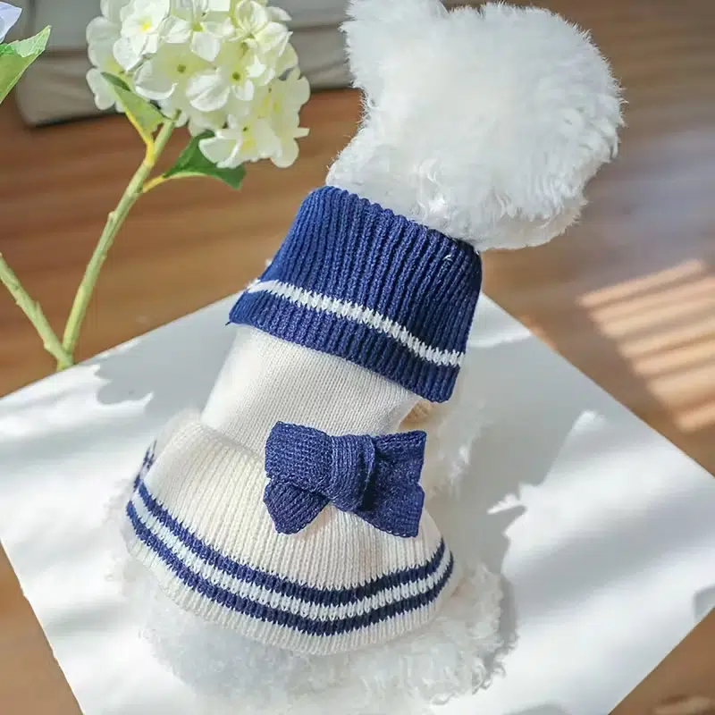 Dress the tiniest trendsetters in timeless sailor style. This best-selling navy & cream striped knit sweater, complete with an oversized bow and fold-down collar, has been a top pick for U.S. pet boutiques, Amazon sellers, and subscription boxes since 2022. Soft acrylic yarn, excellent stretch, and that “Instagram-famous” look that turns every small dog into a walking bestseller.