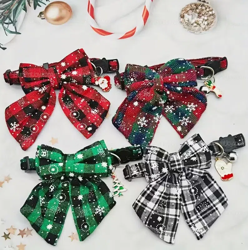 Crafted from durable polyester, our collars come in four vibrant colors: classic red-black, merry green-black, elegant black-white, and multicolored plaid. Each includes a jingle bell and themed charm like Santa or a Christmas tree, perfect for adding holiday cheer to your product line.
