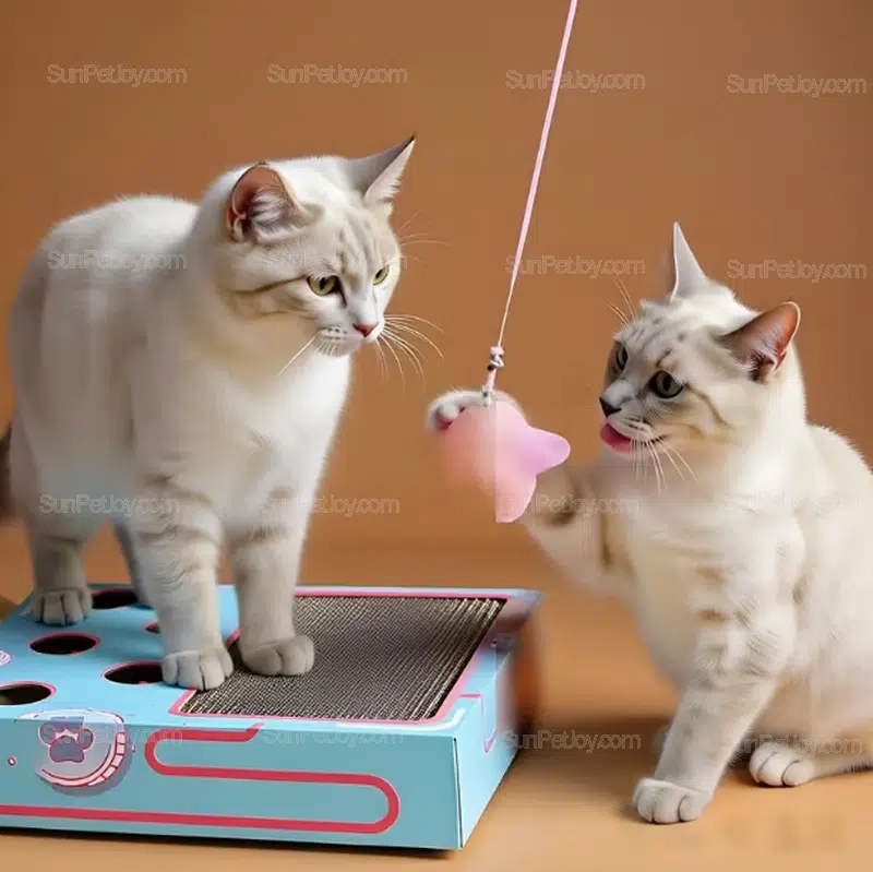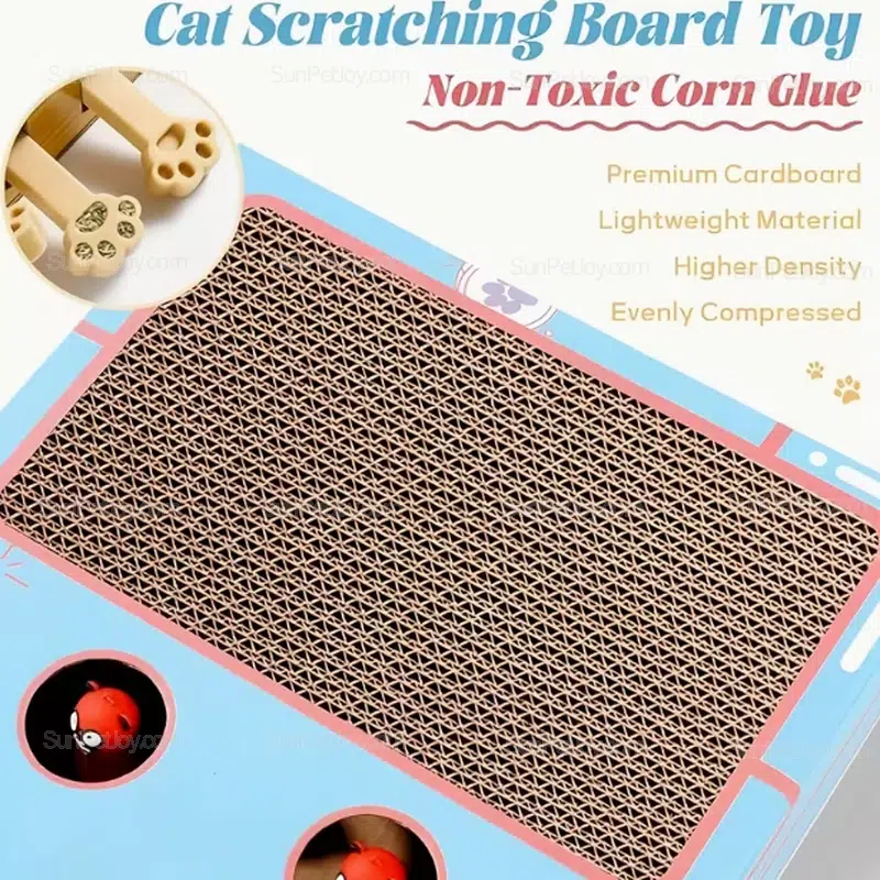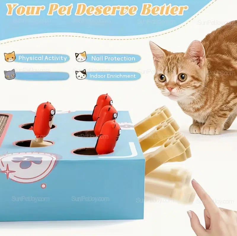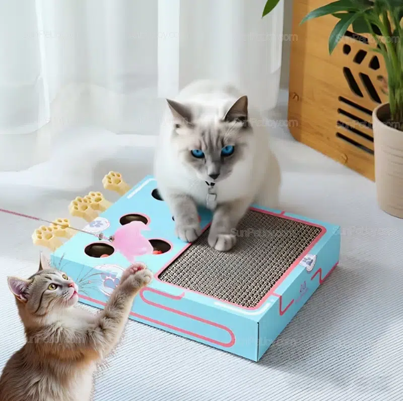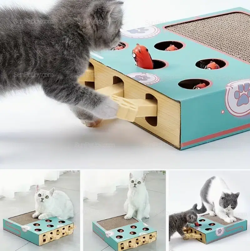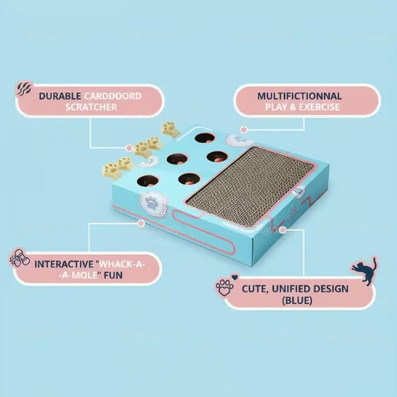 The 3-in-1 structure integrates a high-density cardboard scratching surface, an interactive “whack-a-mole” mouse game, and spring-loaded soft toys.