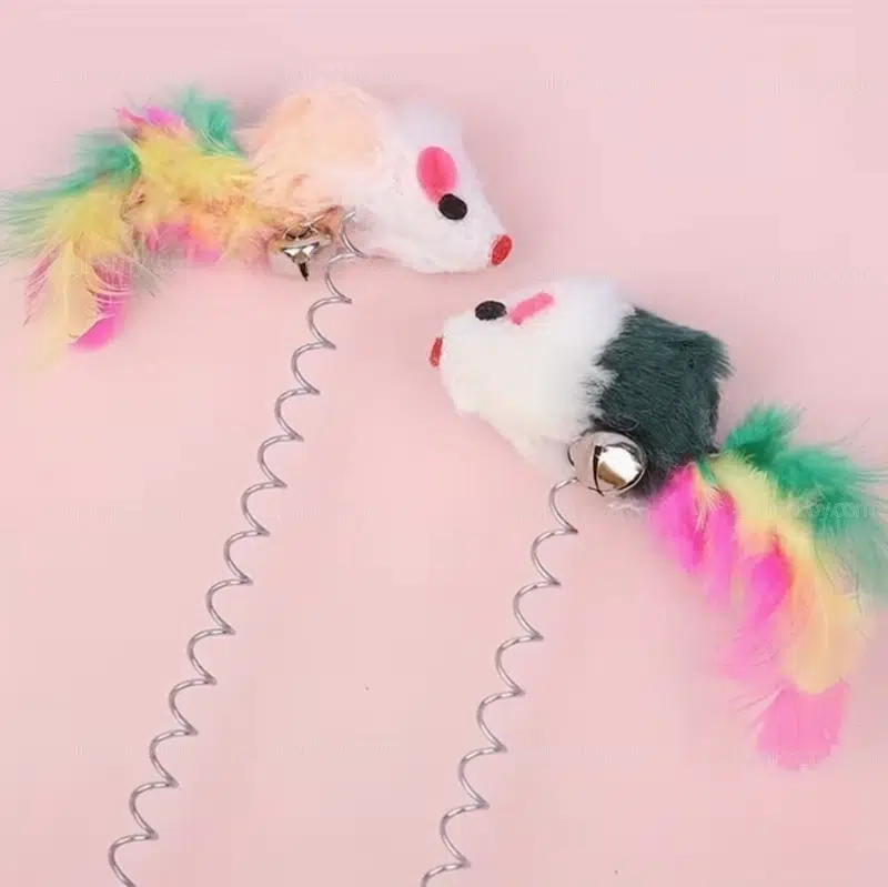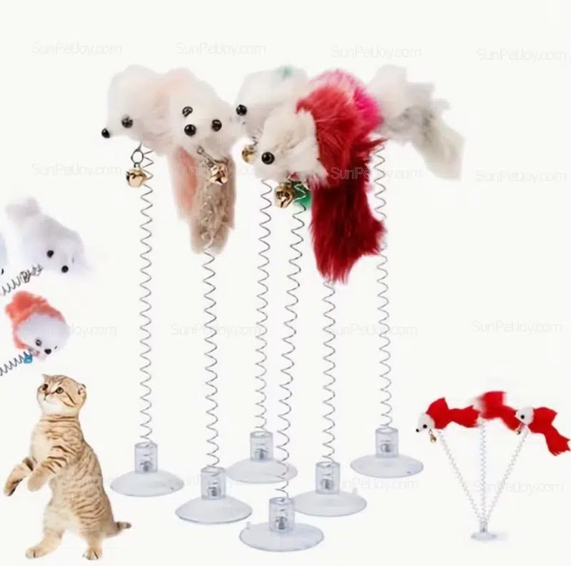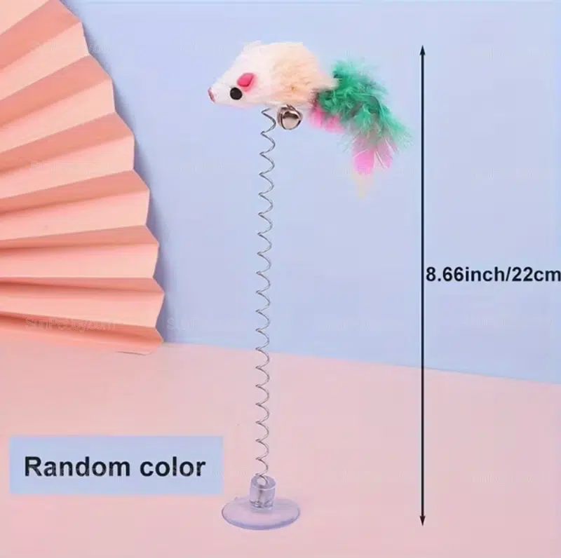 The spring-mounted plush mouse creates natural movement when touched, while the suction base secures firmly on smooth surfaces such as tile, glass, or desks.
