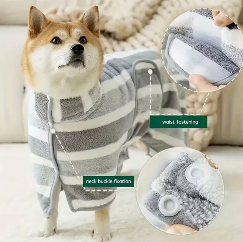 OEM Dog Bathrobes Supplier – Soft Non-Shedding Gray & White Striped Quick-Dry Ultra-Absorbent Robe for Medium to Large Dogs
