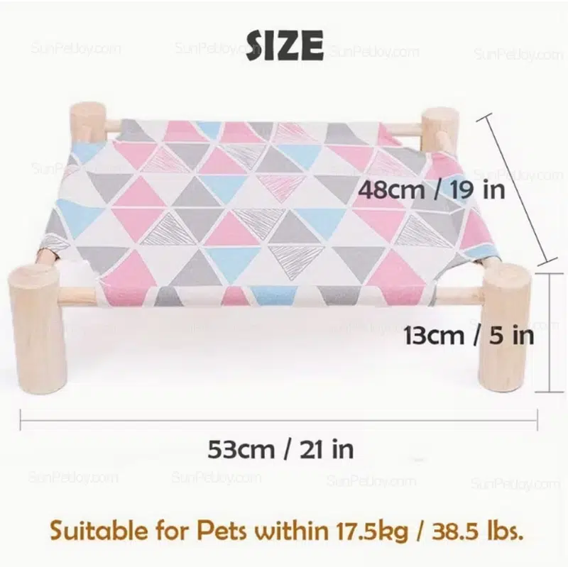 Built with a solid pine wood frame and a tensioned breathable canvas surface, this cat cot offers a balanced
