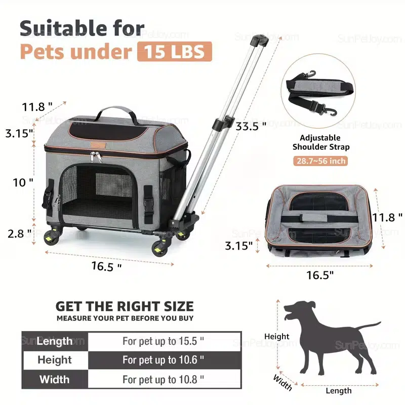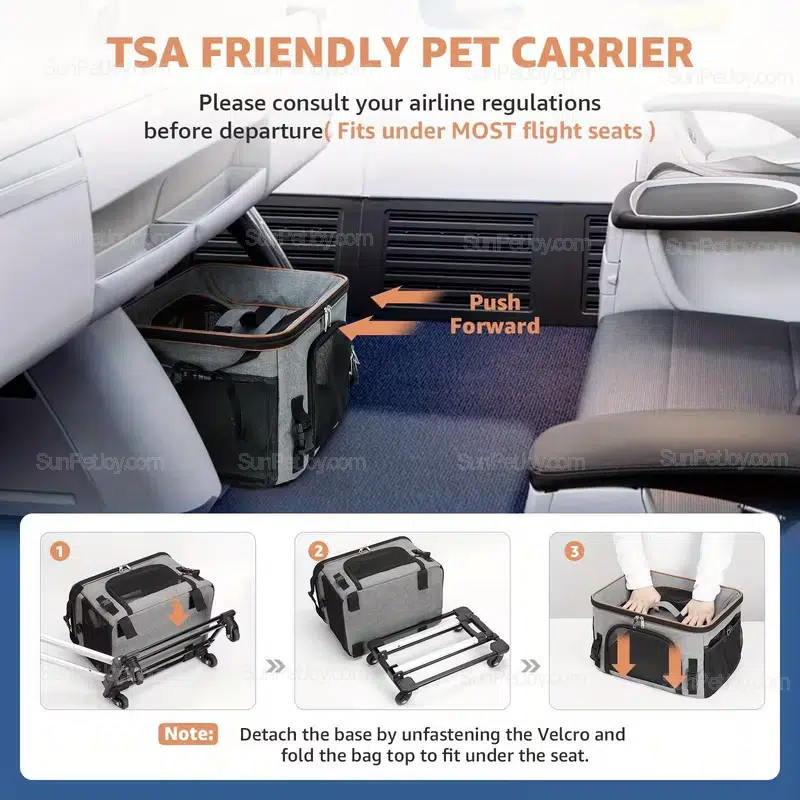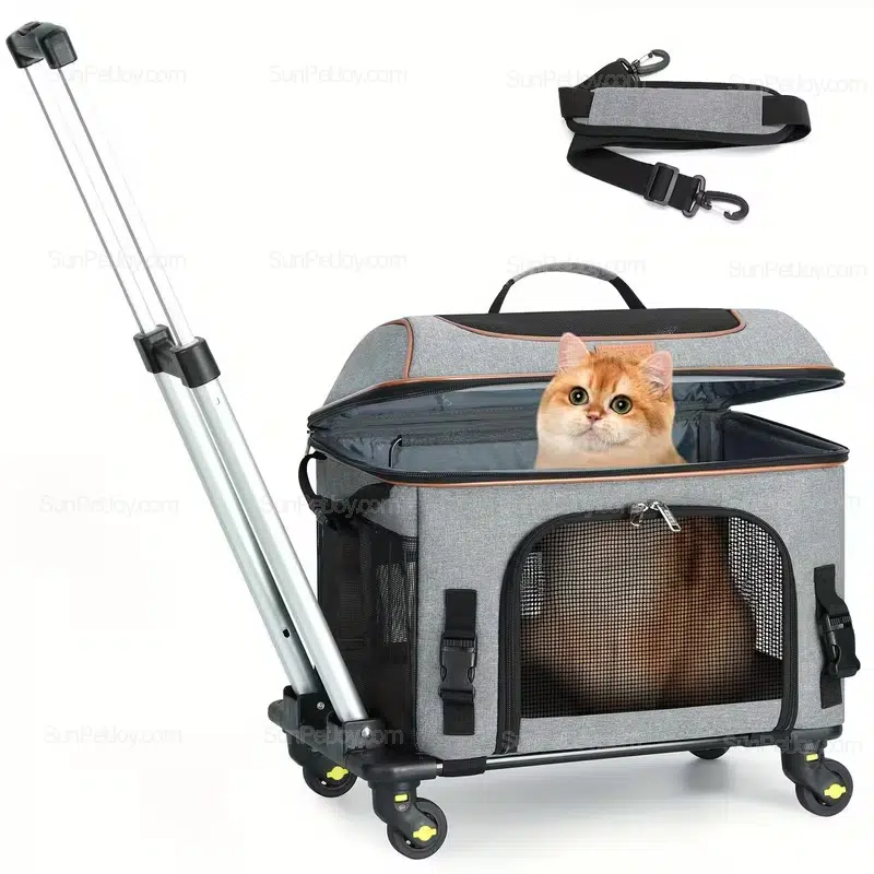 This rolling cat carrier is suitable for airline cabin use, car back seats, airports, hotels, and indoor mobility.