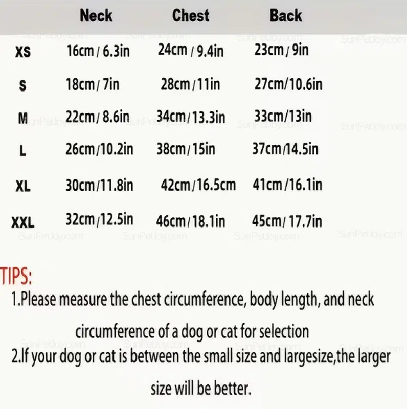 | Size | Neck (cm/in) | Chest (cm/in) | Back (cm/in) |