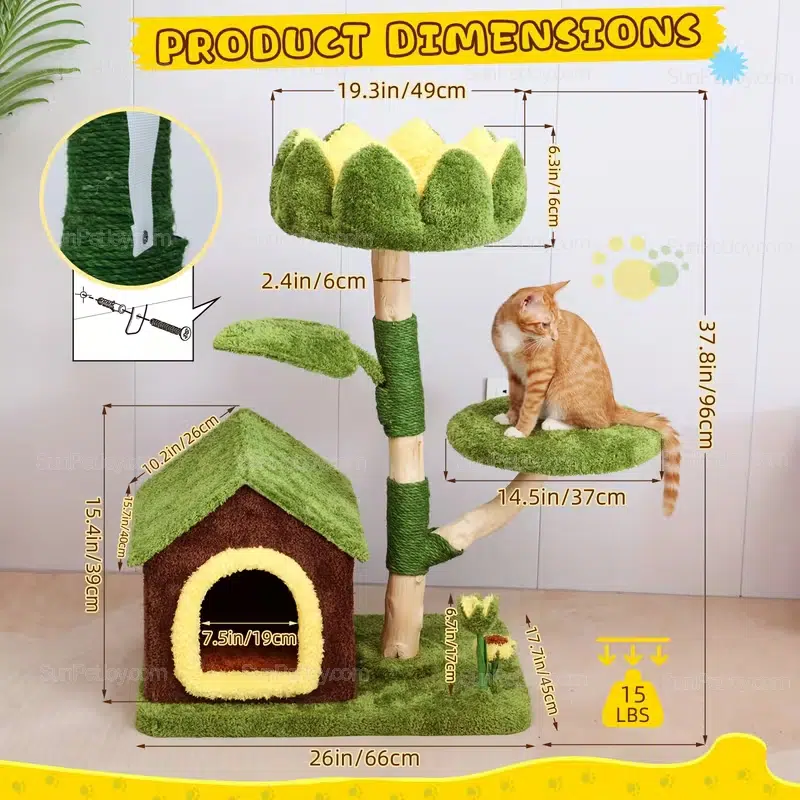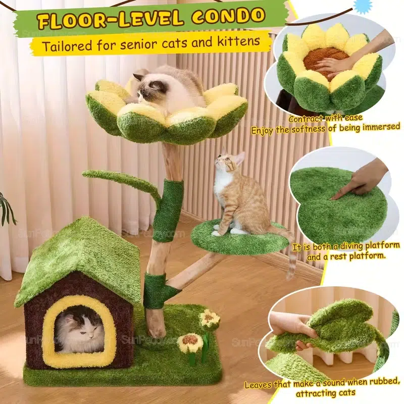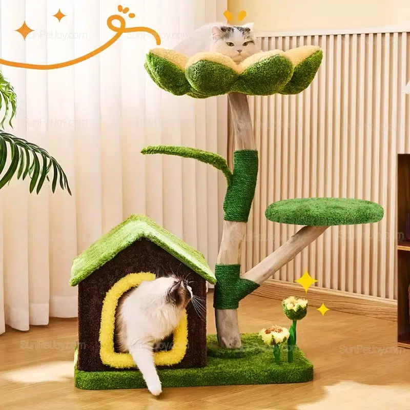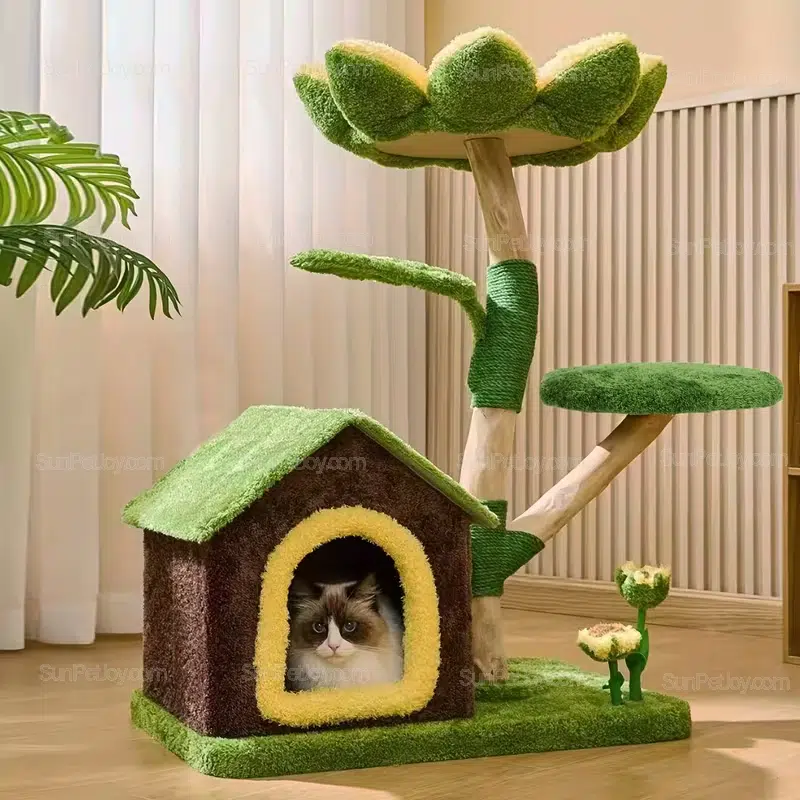 SUNPETJOY develops floor-level cat trees that fit modern indoor living while meeting B2B sourcing needs. This sunflower-themed cat condo combines a soft petal perch, a stable natural-wood style frame, and sisal-wrapped scratching zones—ideal for retailers, brand owners, and distributors building a low-profile cat furniture line for kittens and senior cats.