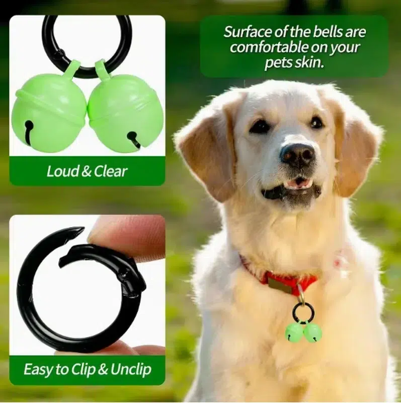 A glow-in-the-dark dog bell accessory designed for night visibility and audible tracking. This clip-on bell set
