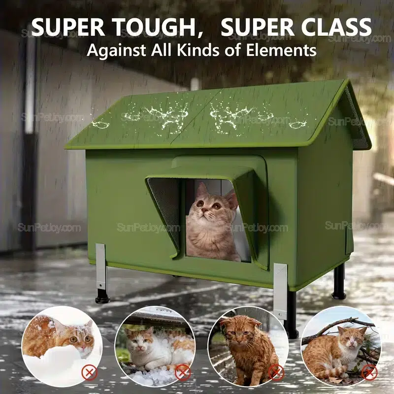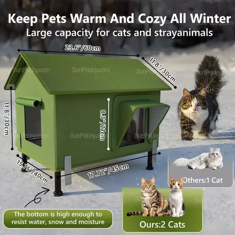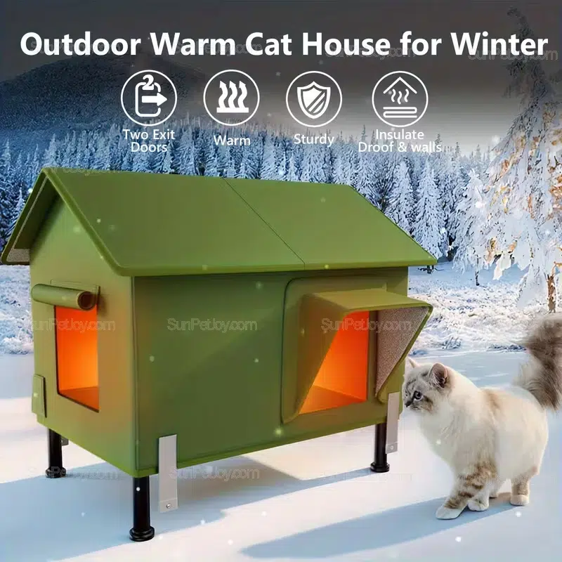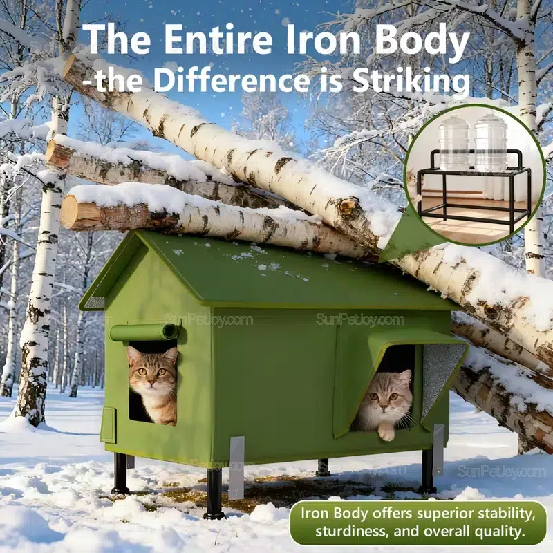 Discover the SUNPETJOY Heated Outdoor Cat House, built tough for winter survival. Robust iron pipe frame withstands snow and wind, keeping stray and feral cats warm with an integrated heating pad and elevated moisture-resistant design. Dual doors allow safe entry/exit.