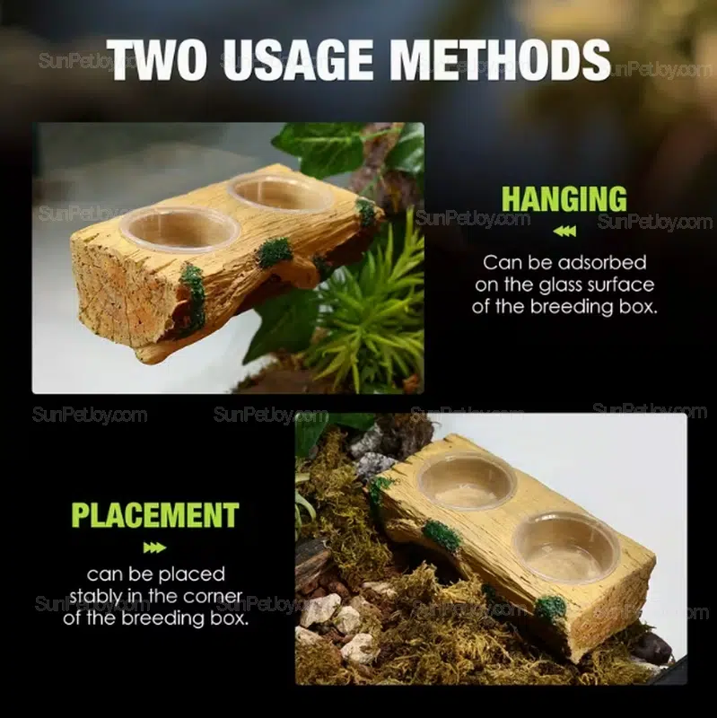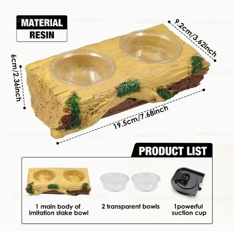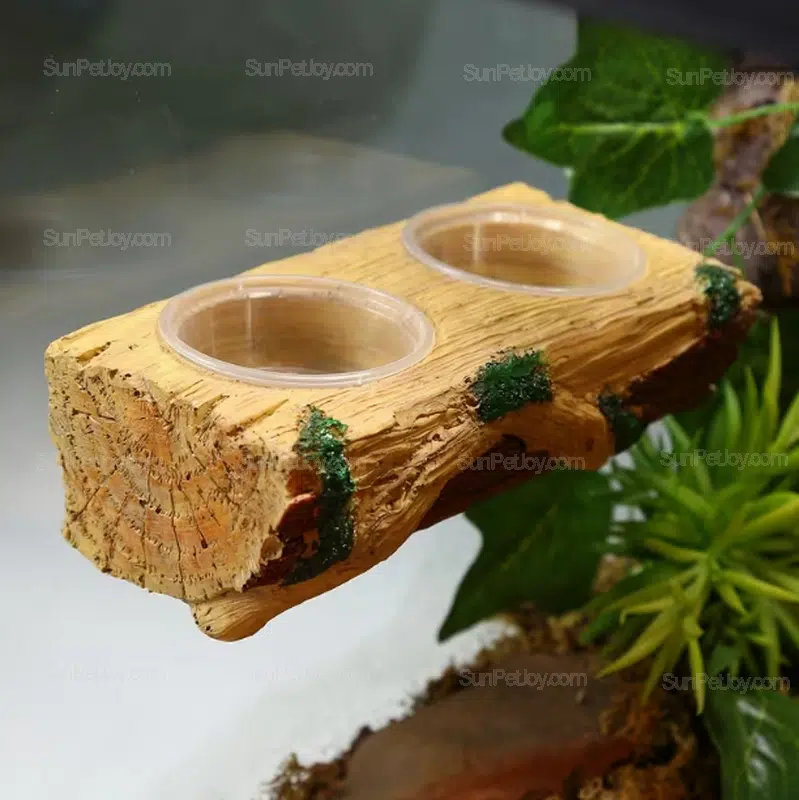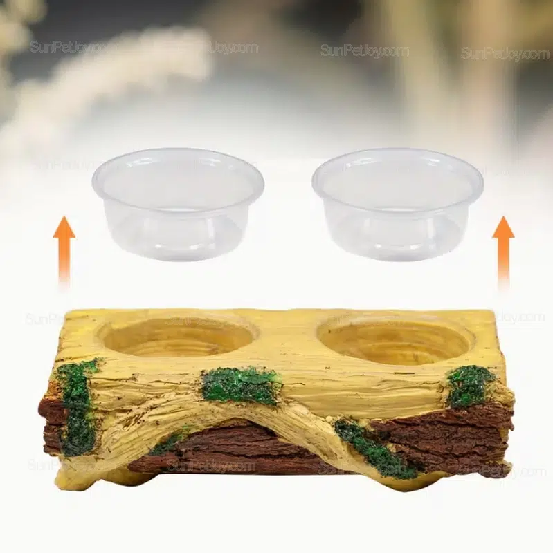 Designed for professional reptile supply chains, this OEM lizards dual bowl feeder is engineered for stable feeding in glass terrariums and breeding enclosures. The feeder combines a simulated wood resin body with two removable transparent bowls, allowing flexible use for water, paste diets, or live food such as mealworms.