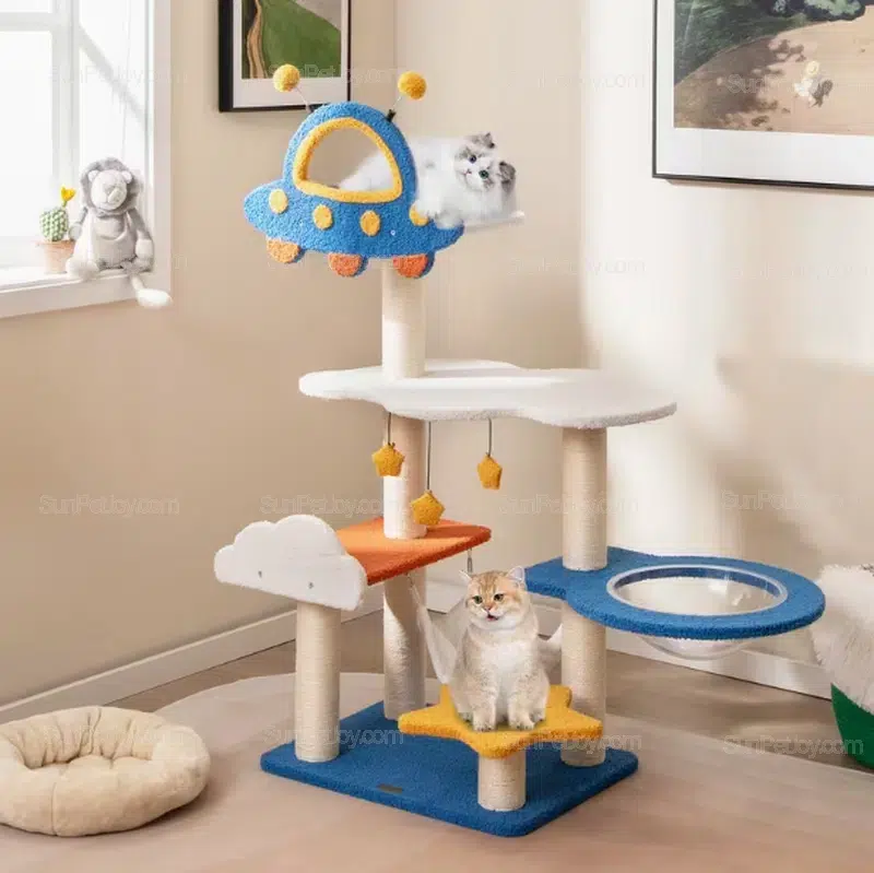 This OEM space-themed cat tree is developed for brands, wholesalers, and pet product distributors seeking a distinctive indoor cat furniture design.