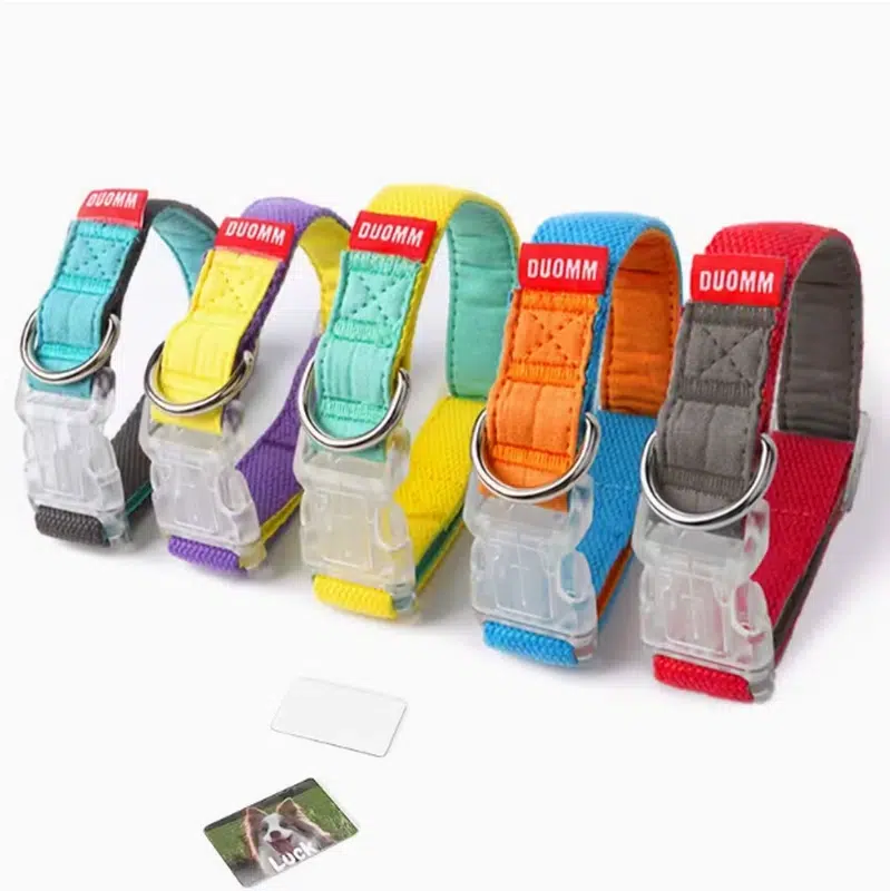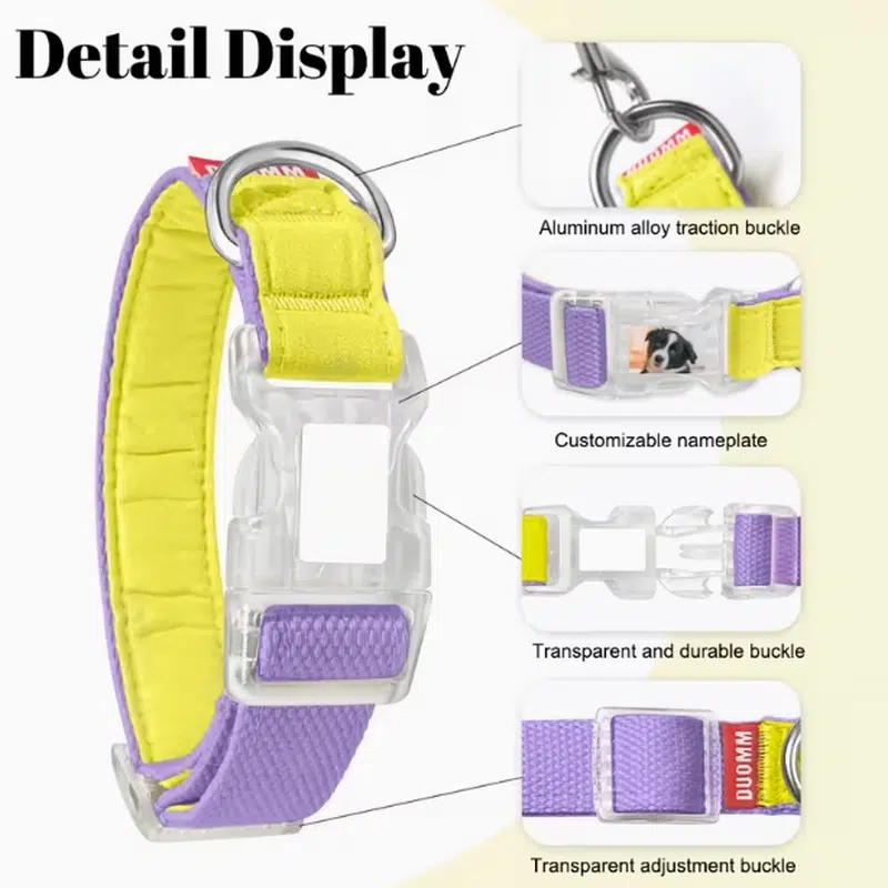 Our Personalized Dog Collars are designed for fast-moving retail and brand customization: a lightweight nylon webbing collar with a soft breathable pad, paired with a transparent buckle that can be printed with a pet name, photo, or text. The color-contrast “V” style helps your customers spot the design at a glance, while the sturdy hardware supports daily walking, grooming-shop add-on sales, and gifting programs.